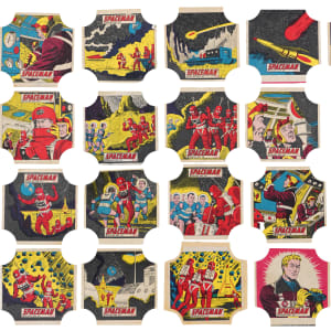 Zoom into another bidding dimension for the offered 1950s Spaceman Lance Larkin bread labels collection of (20) different. These fragile die-cut loaf ends are quite colorful and depict "Spaceman" as he traverses into the great beyond and battles its creatures. This supersonic sci-fi treat generally presents (EX to EX-MT) fronts with varying degrees of expected packaging residue (including one with scrapbook mounting) on the reverses. An incredibly difficult issue that is near impossible to find in such quantity!