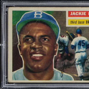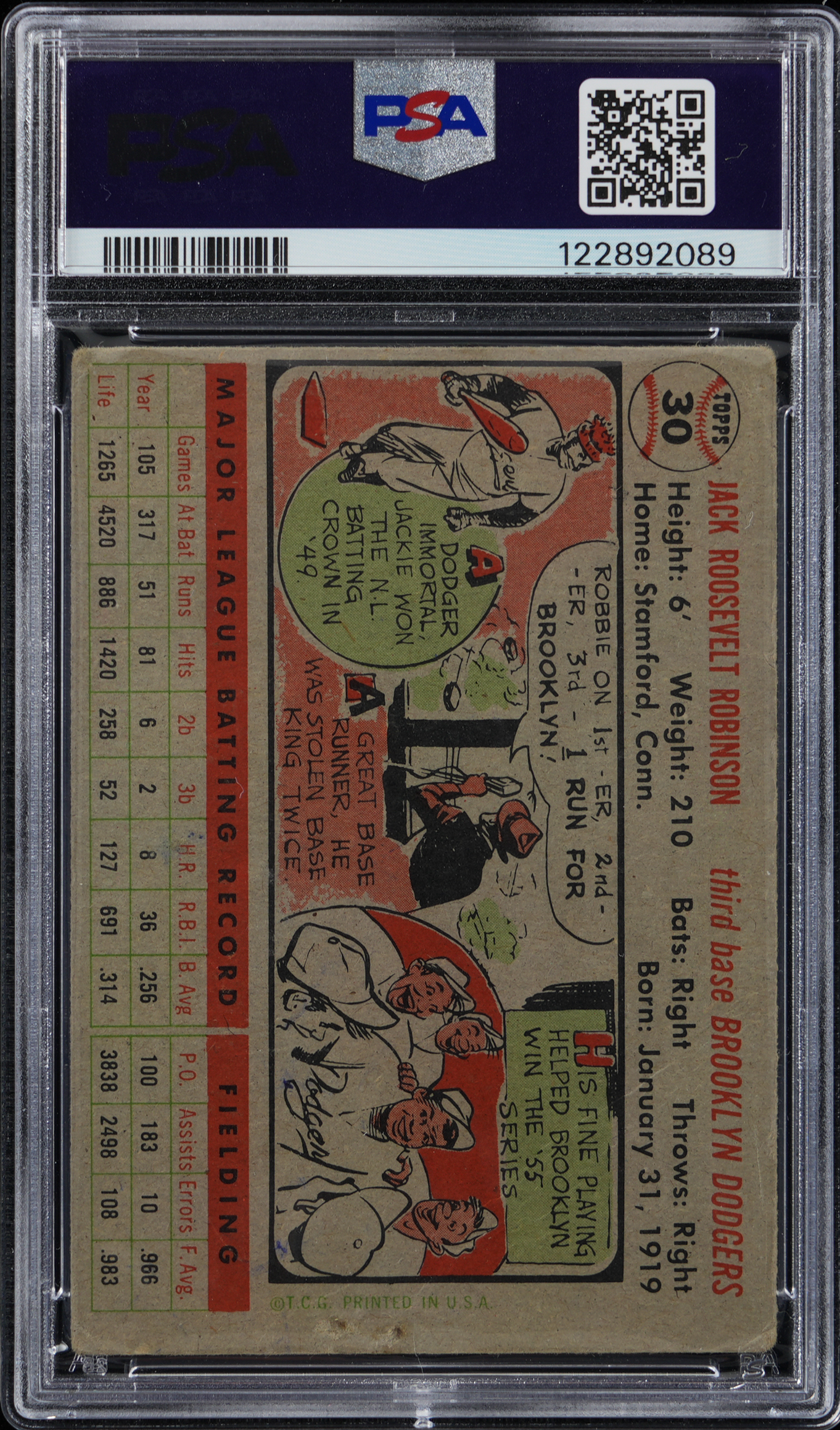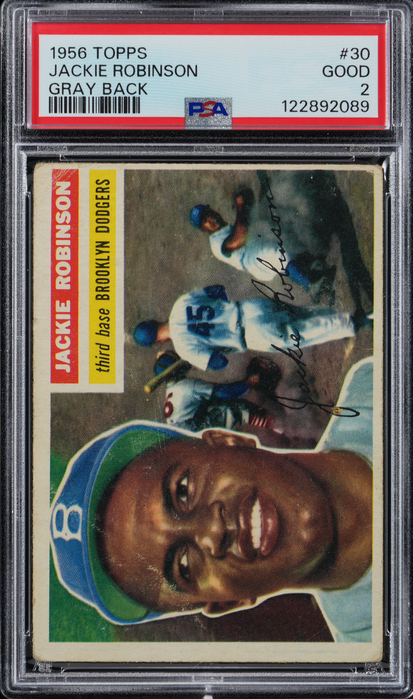 Graded GOOD 2 by PSA. The final Topps flagship card of Brooklyn Dodgers Hall of Famer Jackie Robinson. Gray back version.