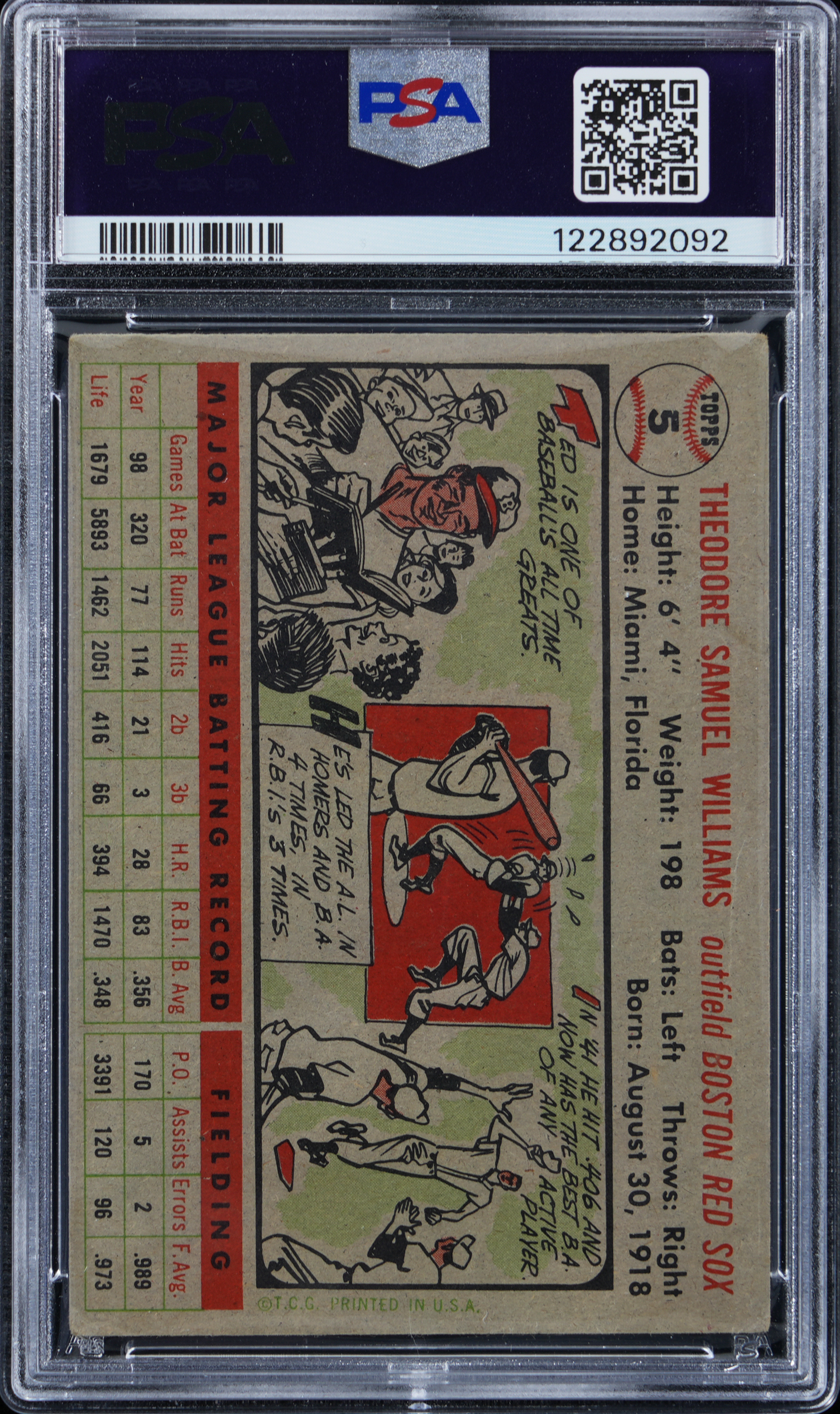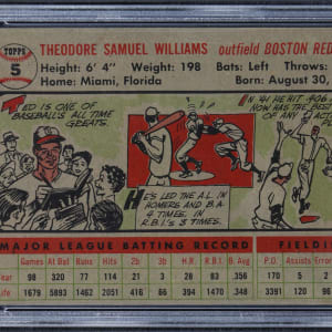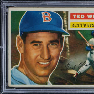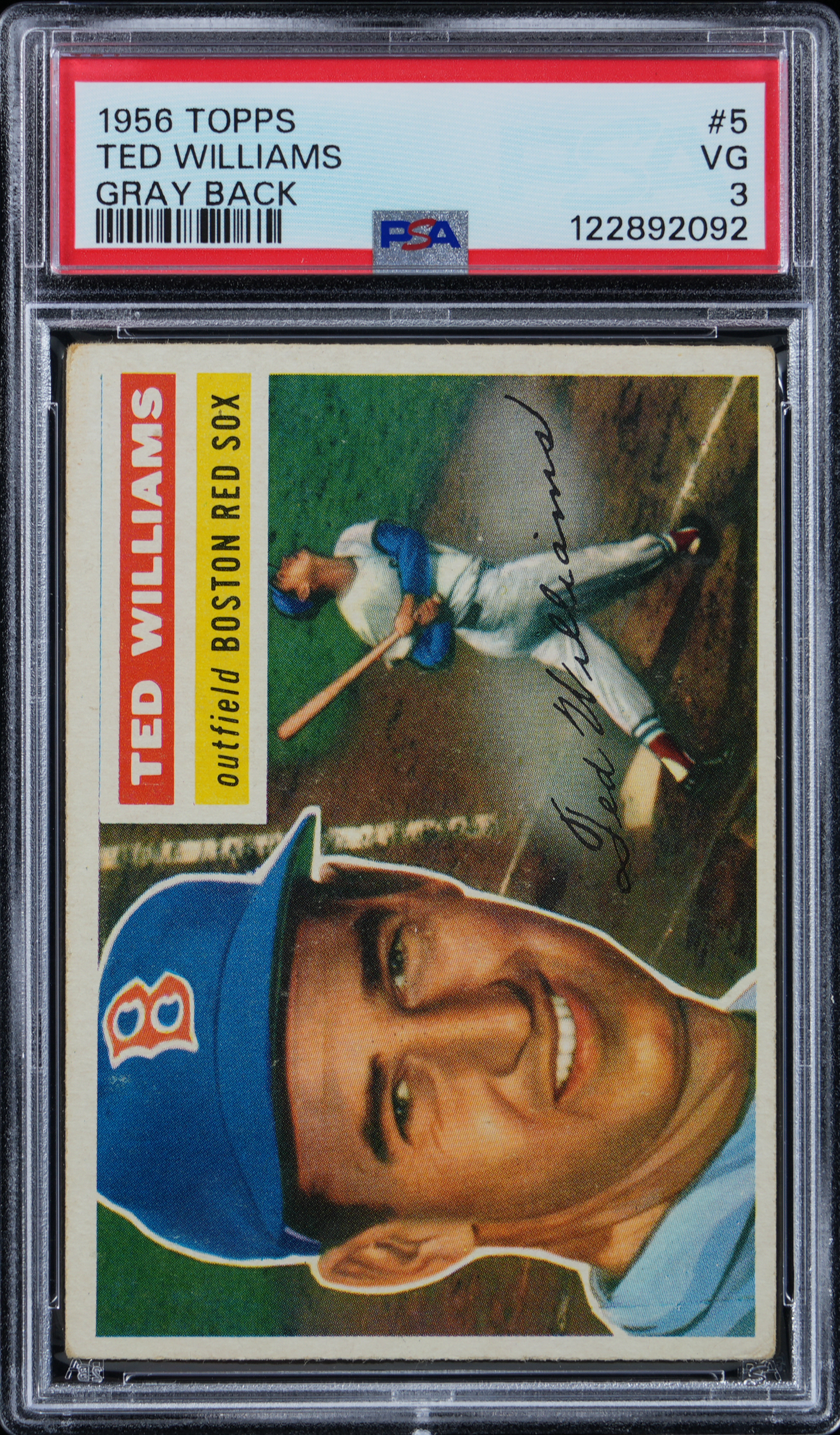 Graded VG 3 by PSA. "Teddy Ballgame" follows through on this clean 1956 Topps #5 single. This crease-free "giant size" card of the Boston Red Sox Hall of Fame slugger comes with a gray back.