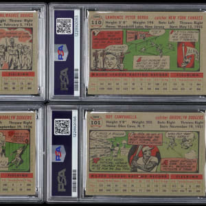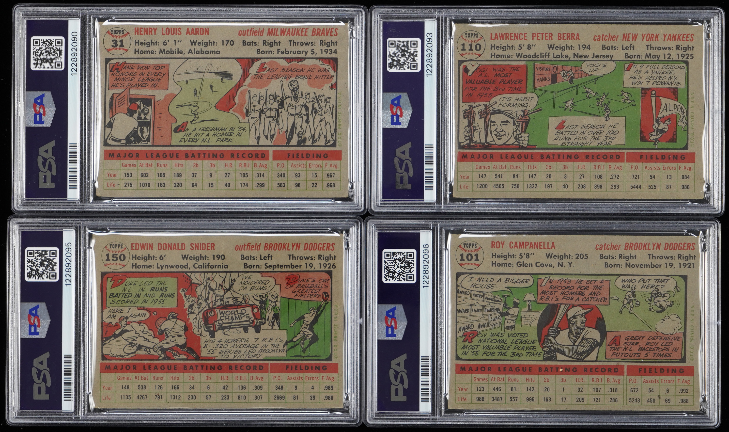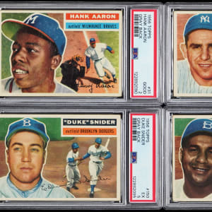 Each graded by PSA. A round tripper of 1956 Topps Hall of Fame singles! The following gray backs are present: PSA EX 5: (2 cards) with #101 Campanella, #150 Snider; PSA VG-EX 4: #110 Berra and PSA GOOD 2: #31 Aaron.
