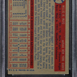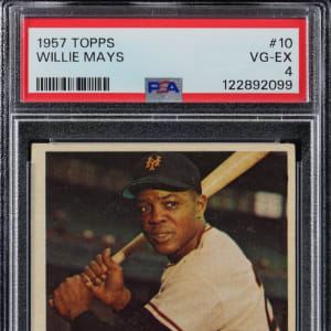 Graded VG-EX 4 by PSA. The Polo Grounds is the historic setting for Willie Mays' final card in a New York Giants uniform. This crease-free beauty displays moderately touched corners, factory crisp edges and clear visual accents.