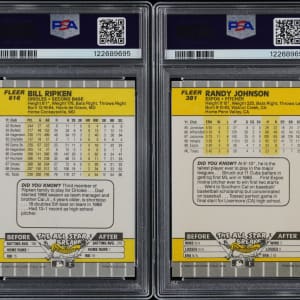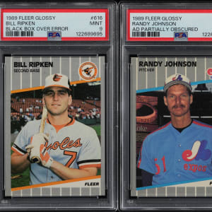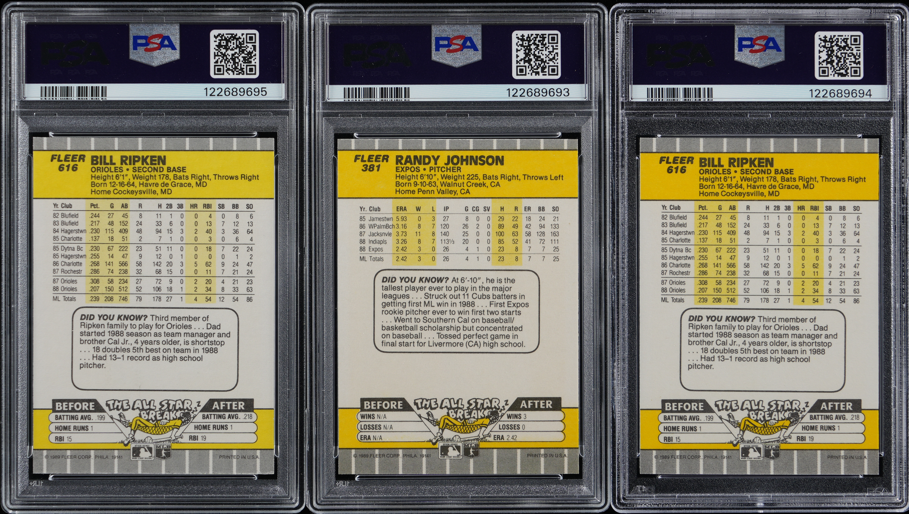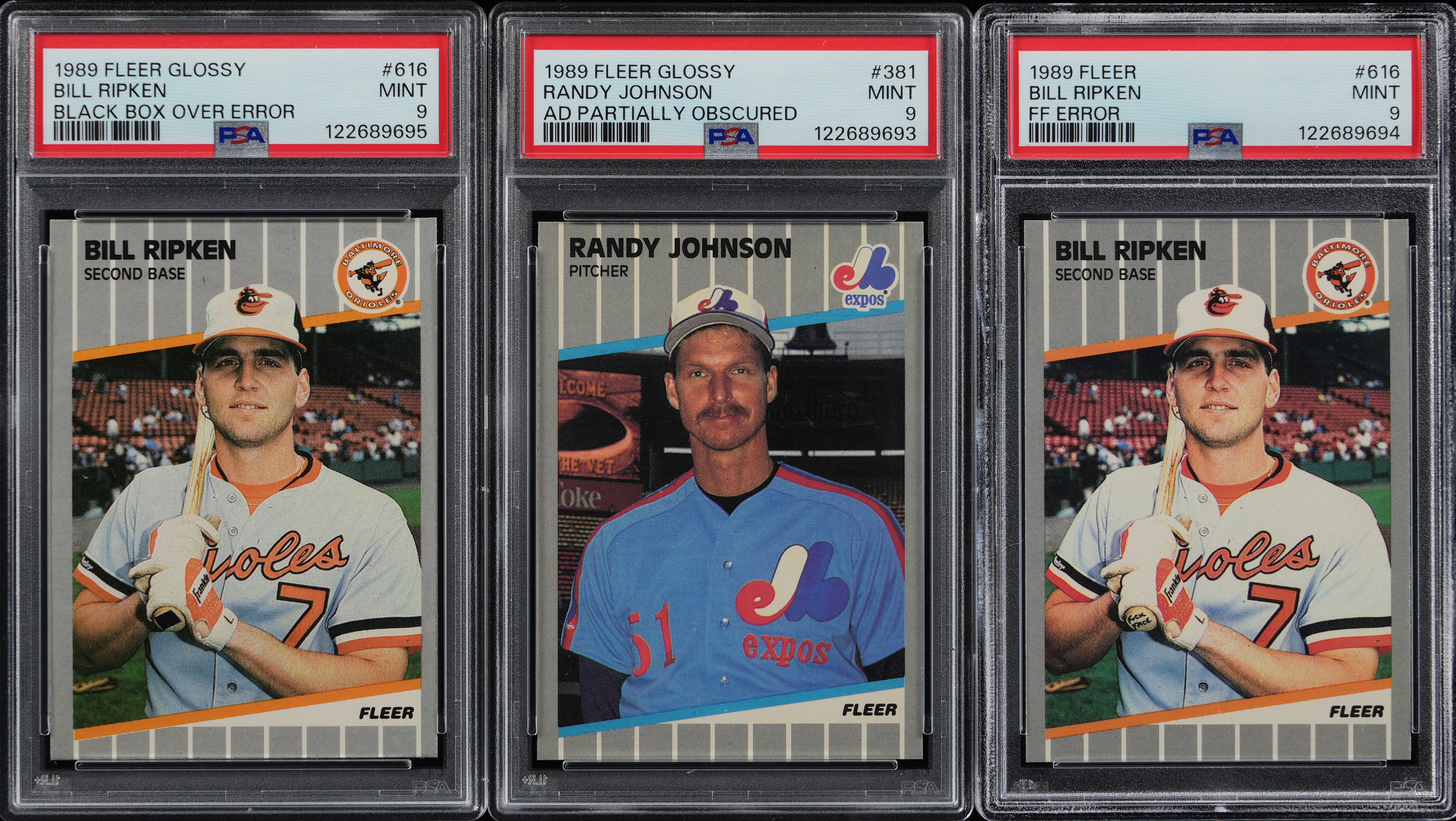 Each graded MINT 9 by PSA. Cap your 1980s error/variation collection with the offered trio of 1989 Fleer keys. Includes: 1.) 1989 Fleer #381 R. Johnson RC (Ad Partially Obscured, mislabeled flip); 2.) 1989 Fleer #616 B. Ripken **** Face and 3.) 1989 Fleer #616 B. Ripken (Black Box, mislabeled flip).