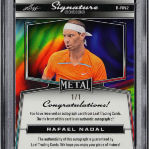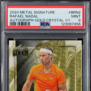 Graded MINT 9 by PSA. Serially numbered #1/1. Over his storied career, Rafael Nadal netted 22 grand slam titles en route to be recognized as one of the finest tennis players in history. The offered 2024 Metal Signature #BRN2 gold crystal autograph is an unique as Nadal's otherworldly talent. A brilliant example with broad global appeal!