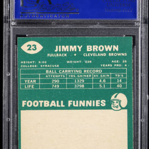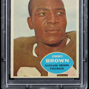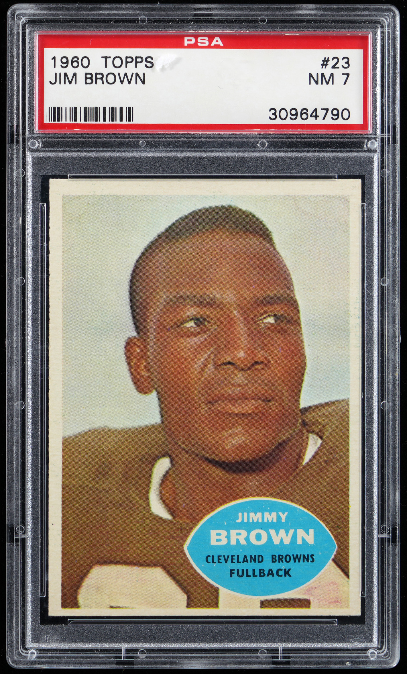 Graded NM 7 by PSA. Keynote 1960 Topps #23 Jim Brown single. Cleveland Browns Hall of Famer.