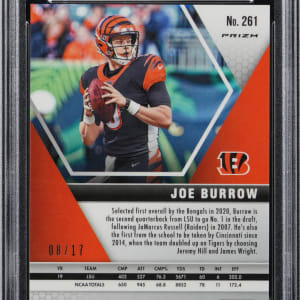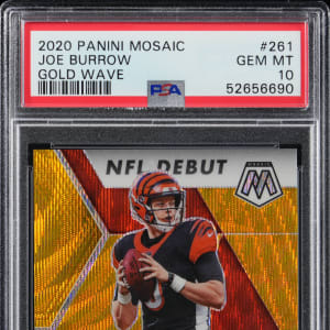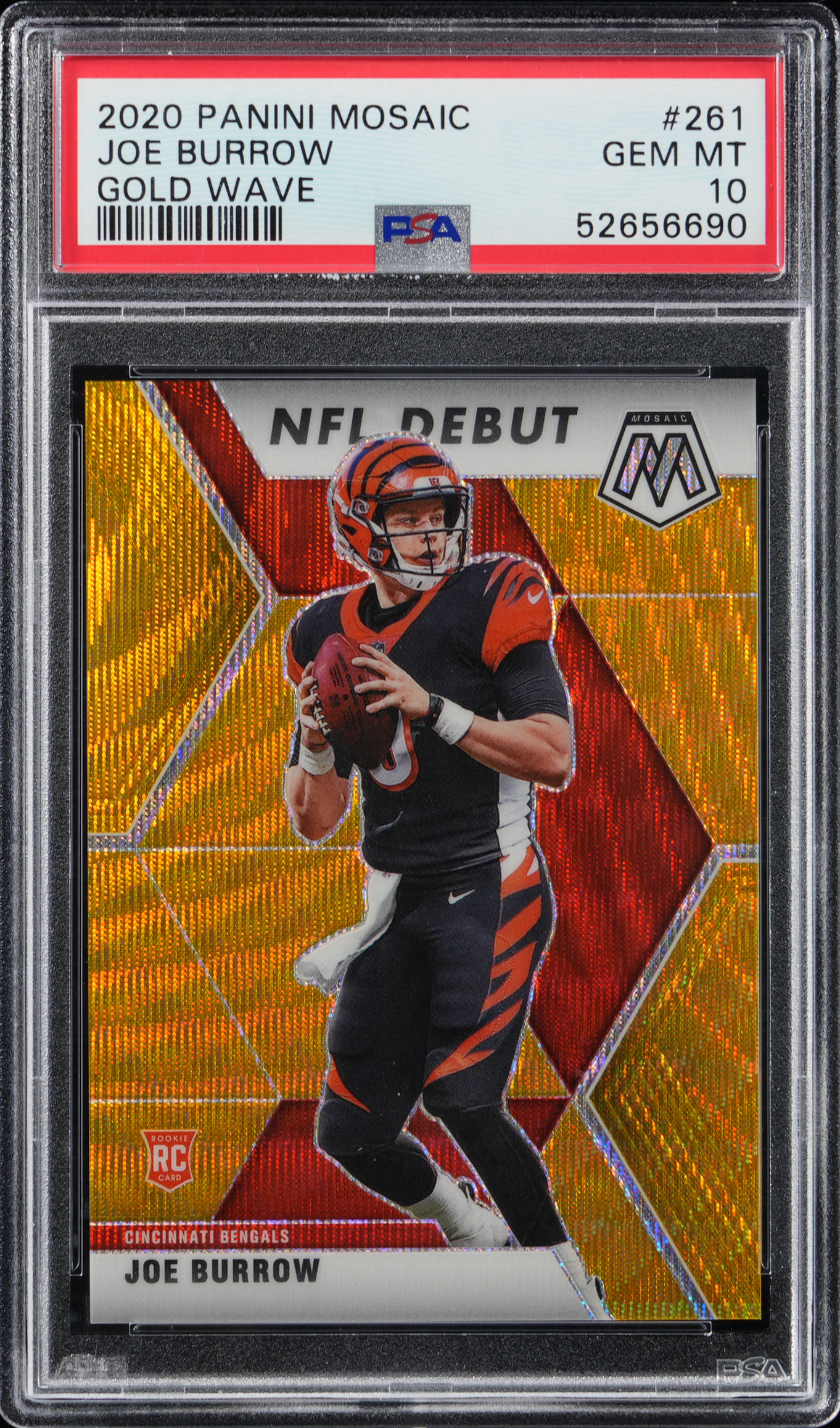 Population 3! Graded GEM MINT 10 by PSA. Serially numbered #8/17. Shimmering 2020 Panini Mosaic Football #261 Joe Burrow rookie card. This premiere of the Cincinnati Bengals superstar quarterback is poised to further surge in value. Gold Wave variation.