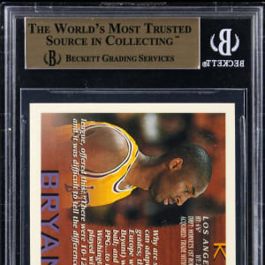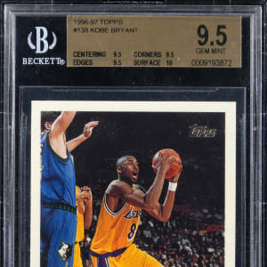 Graded GEM MINT 9.5 by BGS. Want a "blue chip" Hall of Fame rookie card with enormous upside potential? Then look no further than the offered 1996-1997 Topps Basketball #138 Kobe Bryant rookie card! This high-end premiere of "The Black Mamba" boasts the following sub-grades: Centering: 9.5; Corners: 9.5; Edges: 9.5 and Surface: 10.