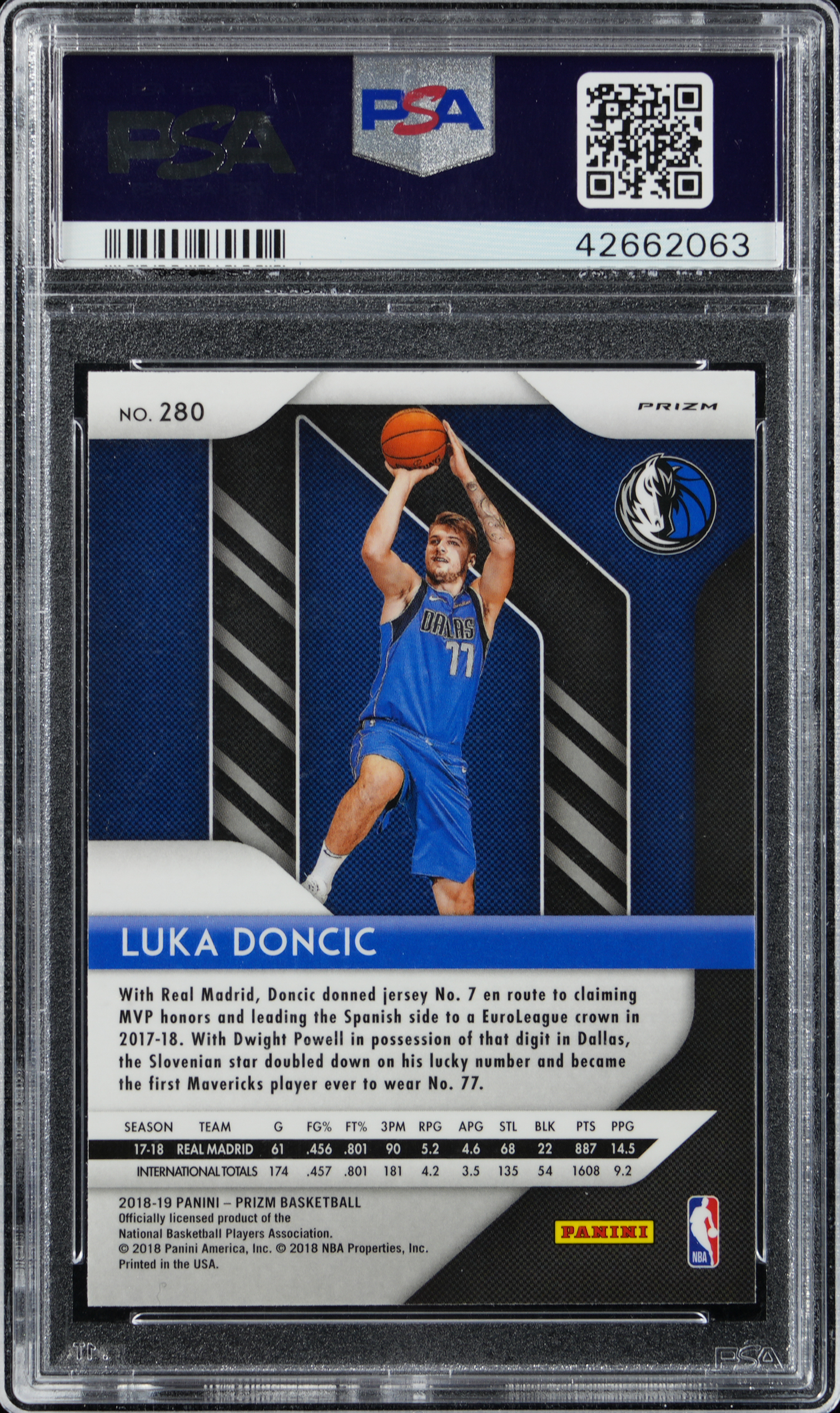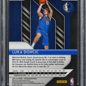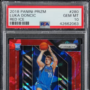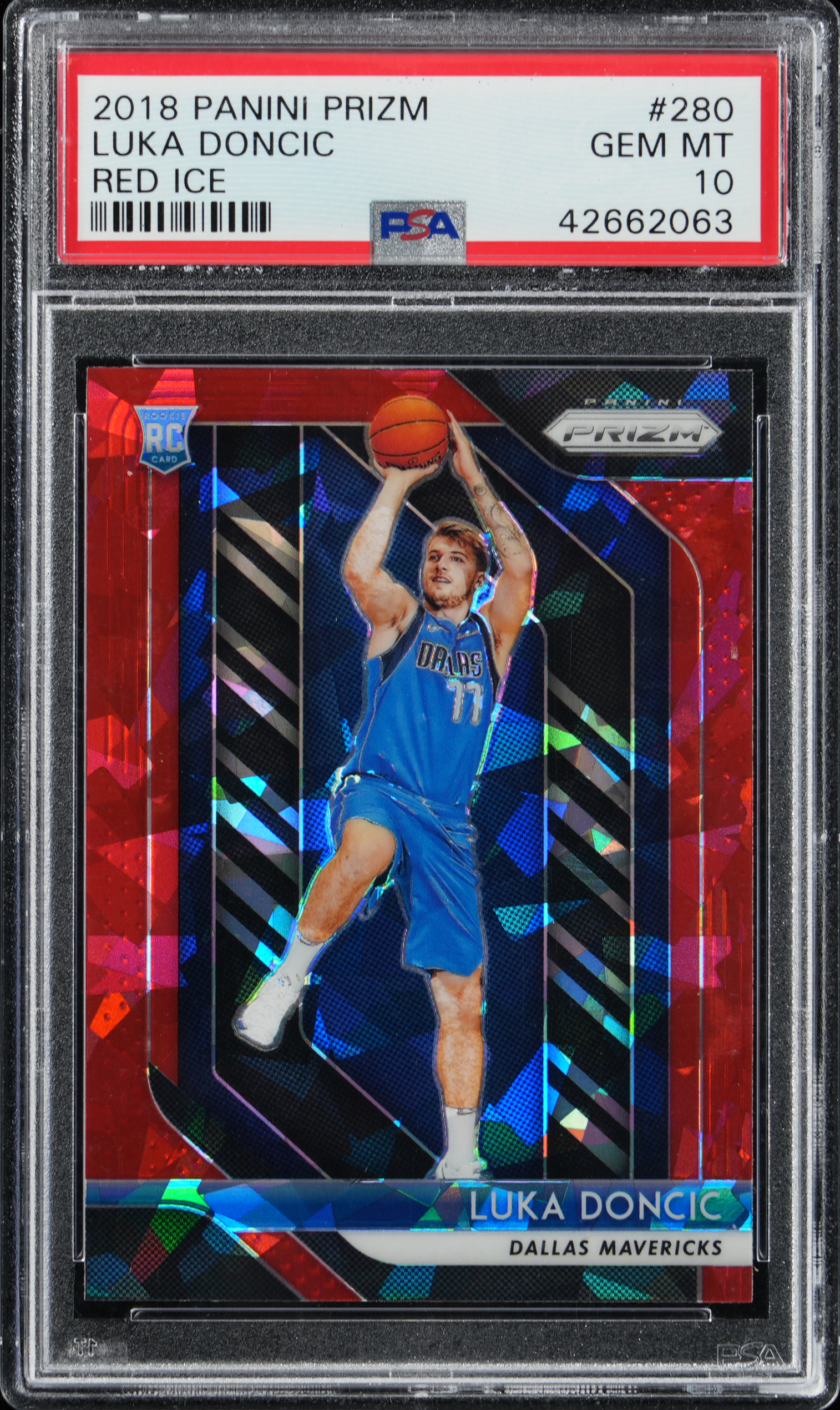 Graded GEM MINT 10 by PSA. Stellar 2018-2019 Panini Prizm Basketball #280 Luka Doncic rookie card. This Red Ice Prizm variant of the Dallas Mavericks (and current Los Angeles Lakers) megastar is simply perfect.