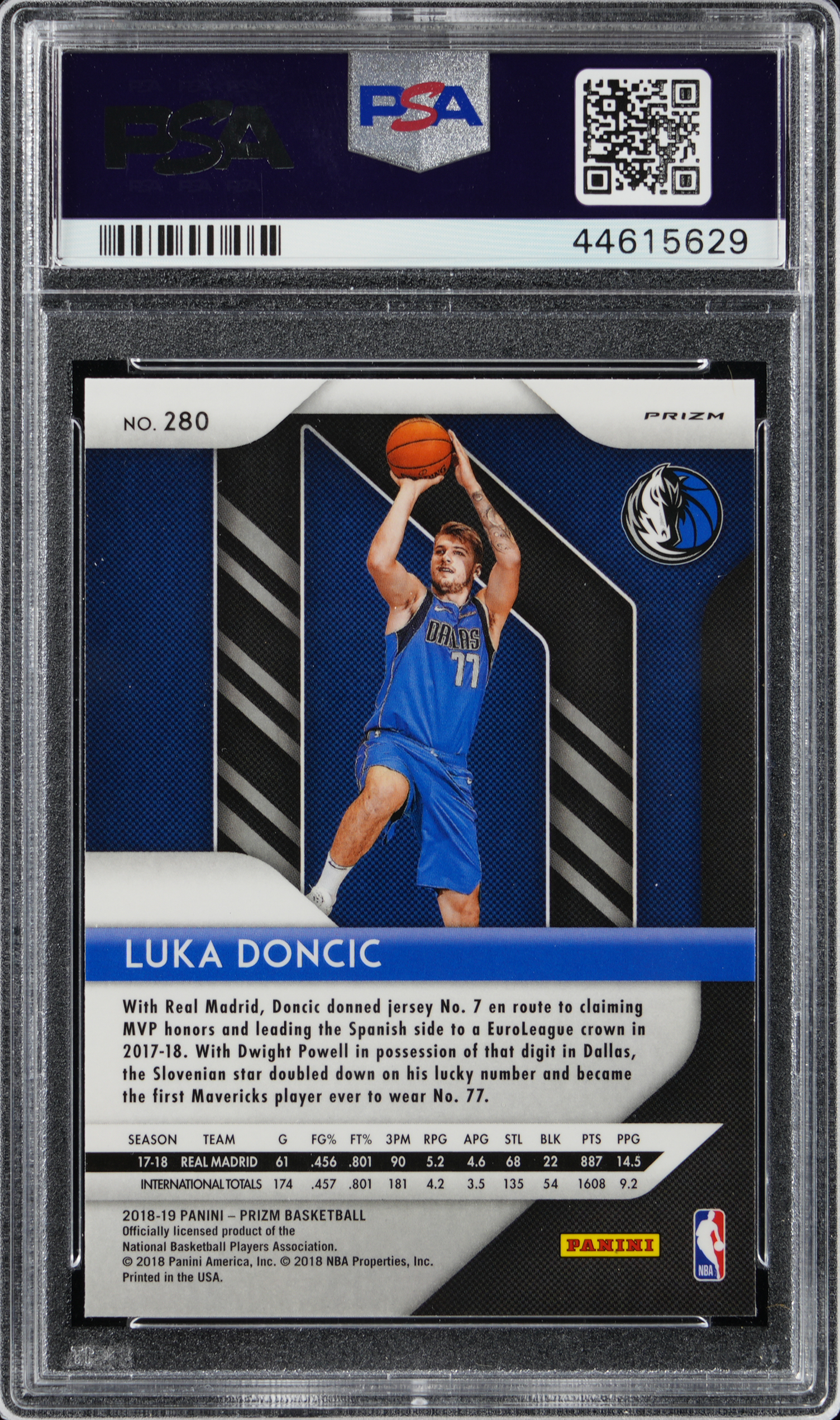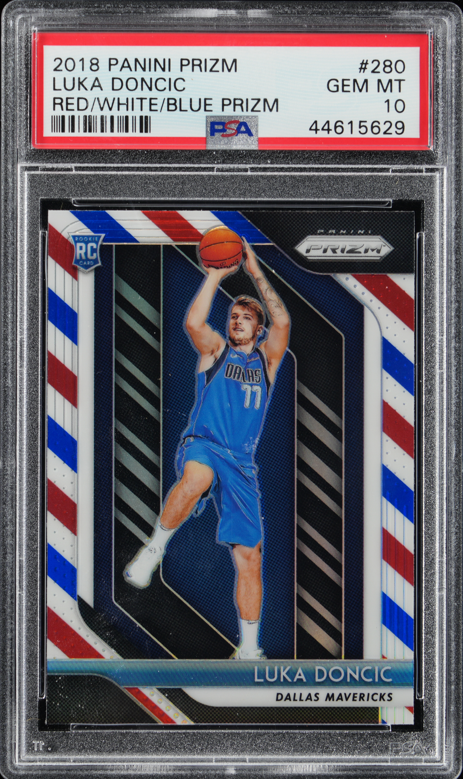 Graded GEM MINT 10 by PSA. Spectacular 2018-2019 Panini Prizm Basketball #280 Luka Doncic rookie card. This pristine red/white/blue edged Prizm of the current Los Angeles Lakers superstar is flawless.
