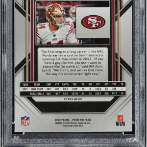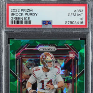 Graded GEM MINT 10 by PSA. The San Francisco 49ers quarterback is a true underdog story who has risen toward the zenith of NFL stardom. Invest in this flawless 2022 Prizm Football #353 Brock Purdy rookie card. Green Ice variation.