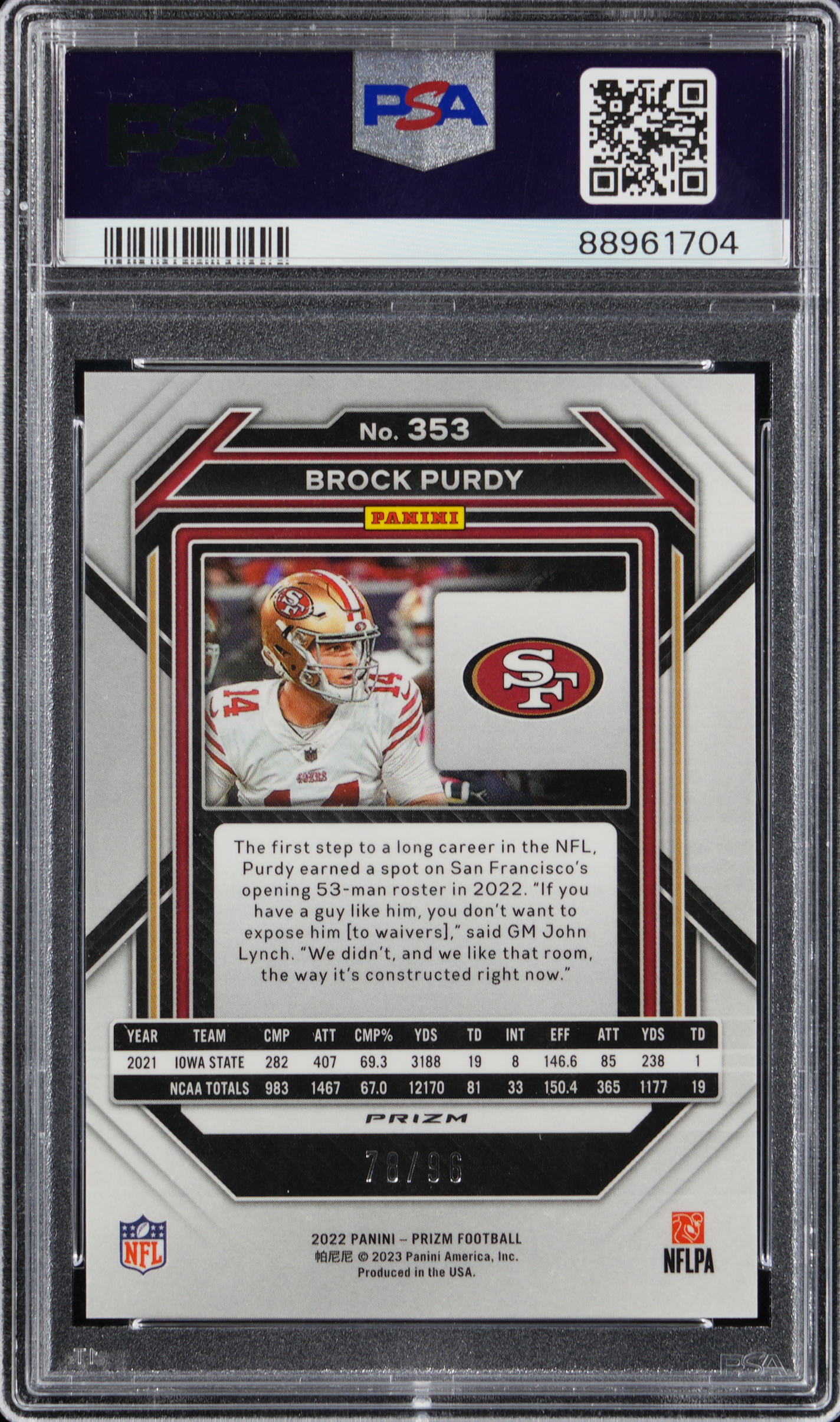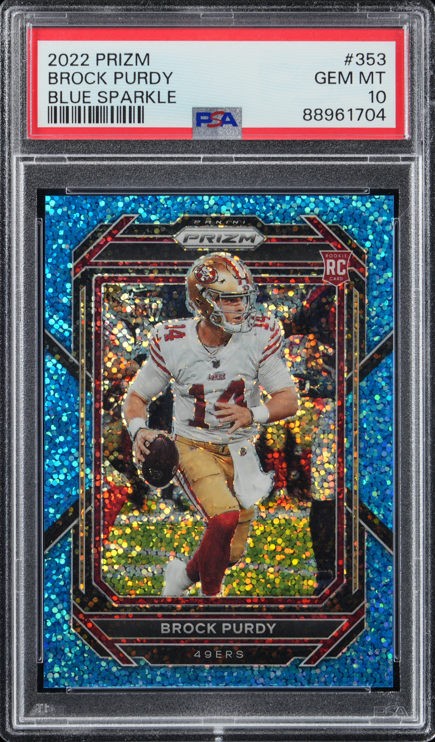 Graded GEM MINT 10 by PSA. Serially numbered #78/96. Dazzling 2022 Prizm Football #353 Brock Purdy rookie card. This San Francisco 49ers star quarterback is perfect in every way. shape, or form. Blue Sparkle variation.