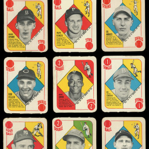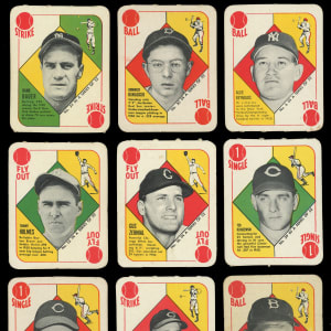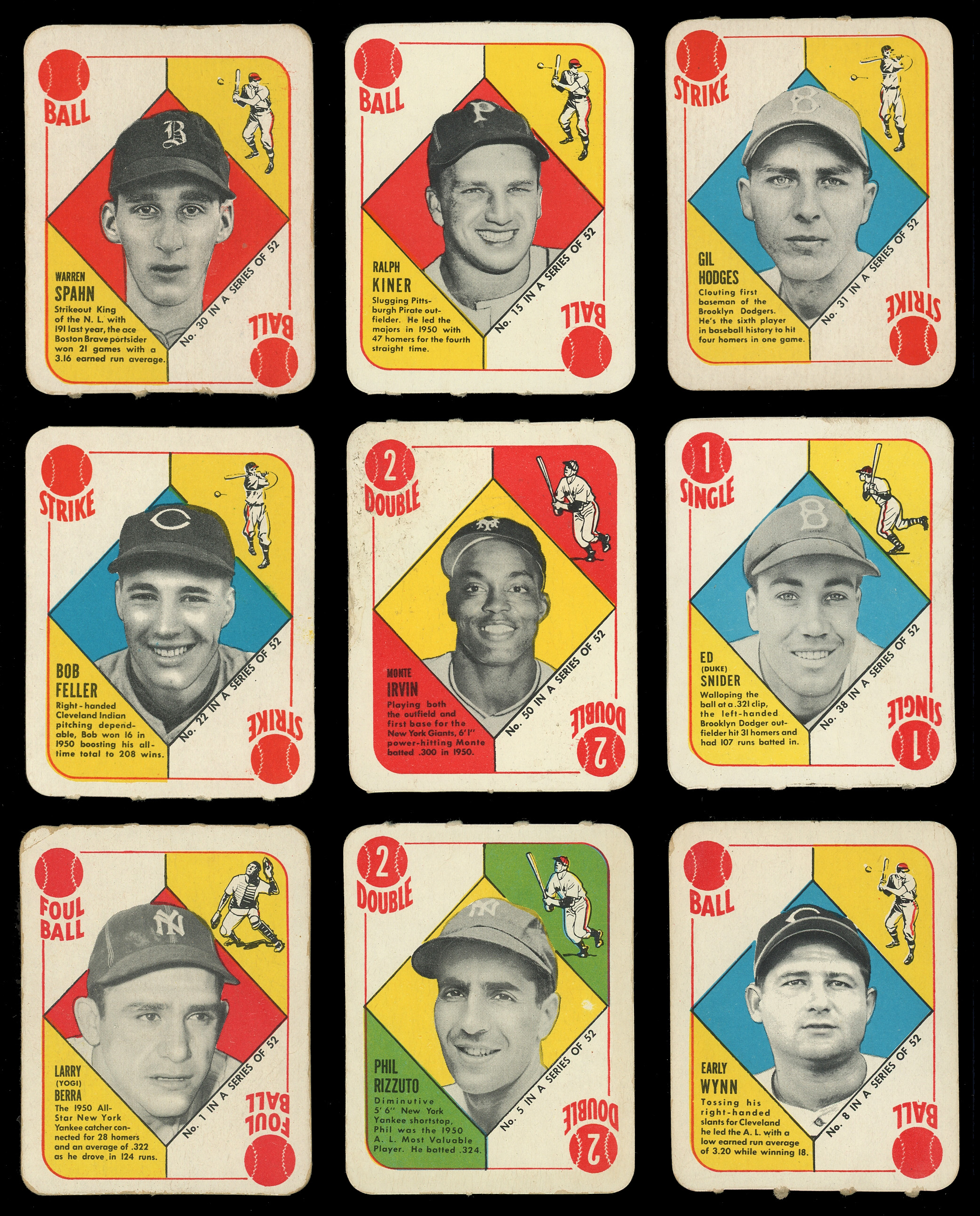 Catch the offered 1951 Topps Red Backs complete master set of (54) cards with the 52-card base set plus both variations. These crisp game cards generally present in the (EX to EX-MT) range with some better or lesser. Highlights include: #1 Berra (FR), #5 Rizzuto (EX), #6 Reynolds (EX), #8 Wynn (EX), #15 Kiner (EX), #20 D. DiMaggio (EX), #22 Feller (GD), #24 Bauer (EX-MT), #30 Spahn (VG-EX), #31 Hodges (VG-EX), #36 Zernial (EX-MT, Chicago in Bio), #38 Snider (VG), #39 Kluszewski (EX-MT), #50 Irvin RC (VG) and #52 Holmes (VG, Boston in Bio).