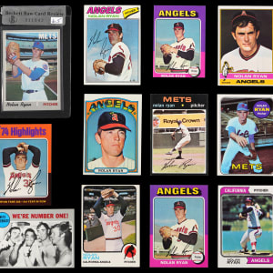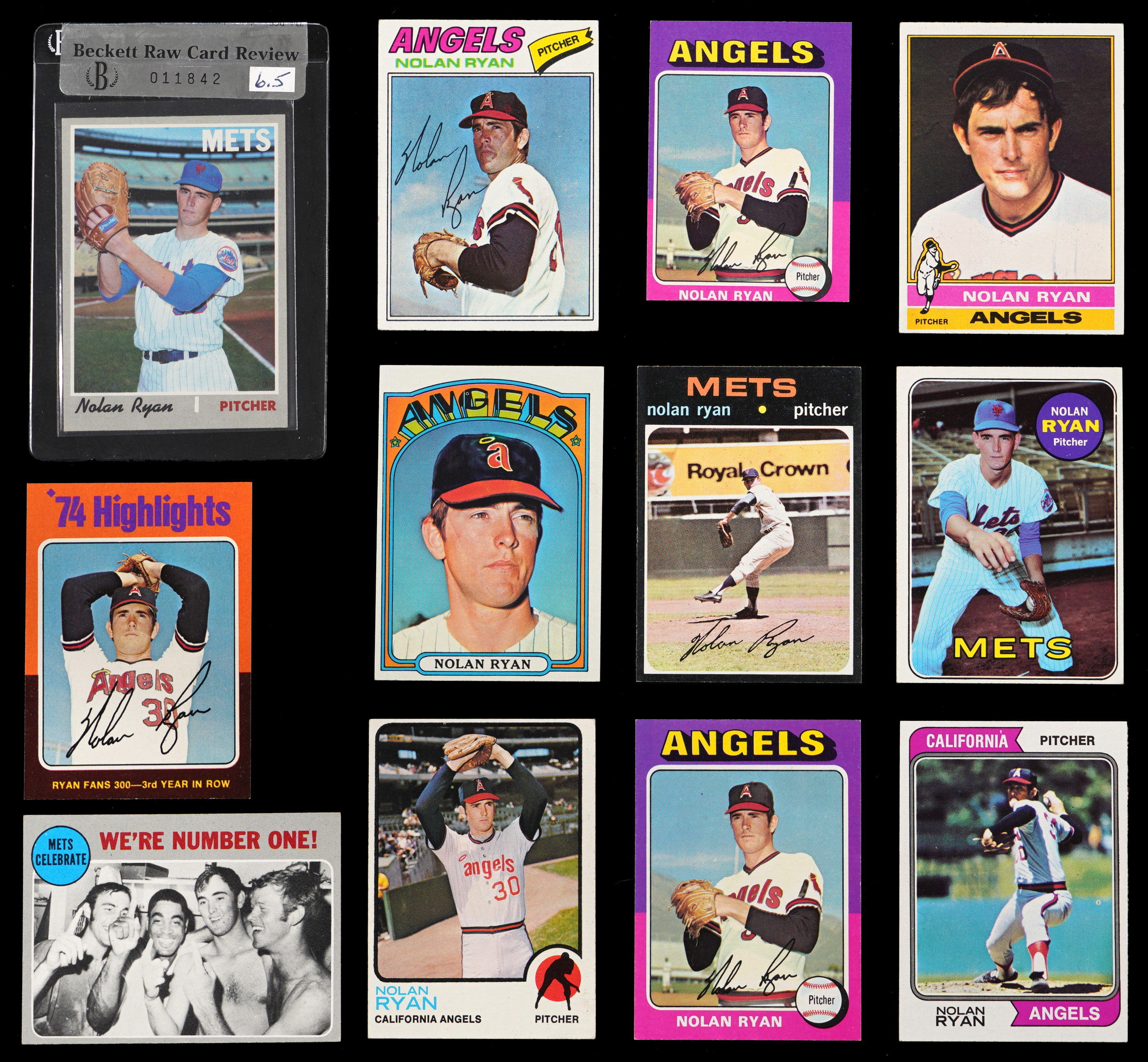 1960s-1970s Topps Ryan: (26 cards, average EX-MT) with 1969 Topps #533 (EX), 1970 Topps: #197 Ryan Playoffs (EX-MT), #198 Mets Celebrate/Ryan (EX), #712 (Beckett Raw Card Review 6.5); 1971 Topps #513 (EX-MT), 1972 Topps #595 (EX-MT), 1973 Topps: #67 LL with Carlton (EX), #220 (VG-EX); 1974 Topps: #20 (EX-MT), #207 LL with Seaver (NM); 1975 Topps: #5 HL (EX-MT), #500 (EX-MT); 1975 Topps Mini: #5 HL (EX), #500 (VG-EX); 1976 Topps #330 (EX), 1977 Topps: #234 RB (EX-MT), #650 (EX); 1978 Topps: #6 HL (EX-MT), #400 (EX-MT); 1979 Topps #115 (EX);