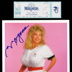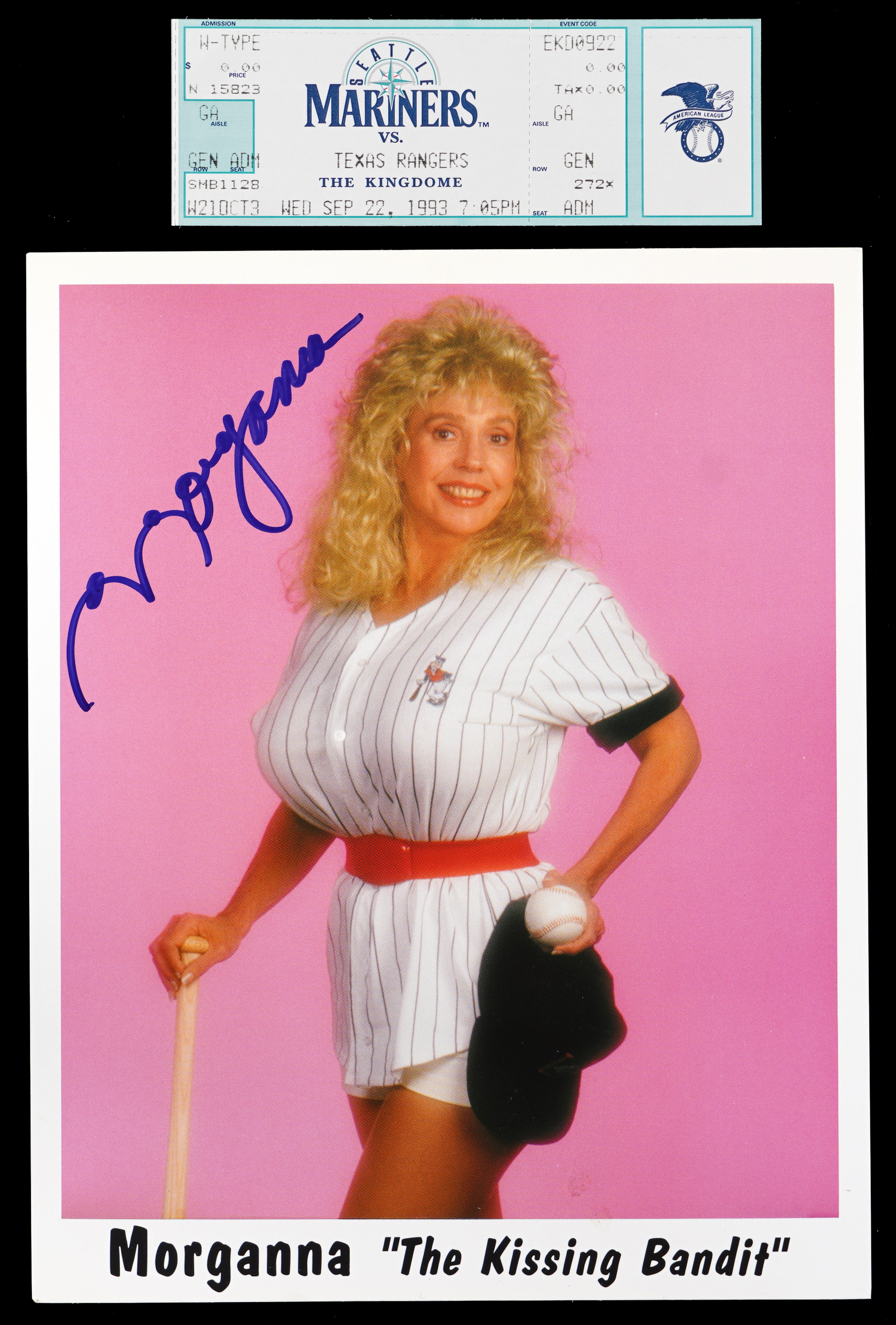 Morganna The Kissing Bandit signed 8x10 photo with (9-10) signature. It comes with photo from the day she made Nolan Ryan one of the 37 major leaguers she kissed om the field in the 1970s and 80s.