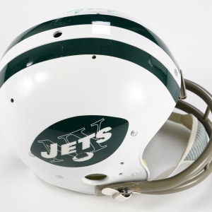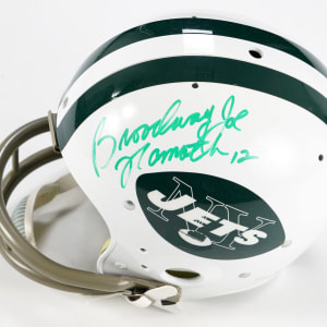 With the flare of an actor and man about town, the most famous Jets quarterback of all-time has signed this dark green on white 7 3/8 Kra-Lite Lacquer full-size helmet with a big, dramatic “Broadway Joe Namath 12” signature grading (“8-9”). It has a PSA/DNA sticker and accompanying COA.