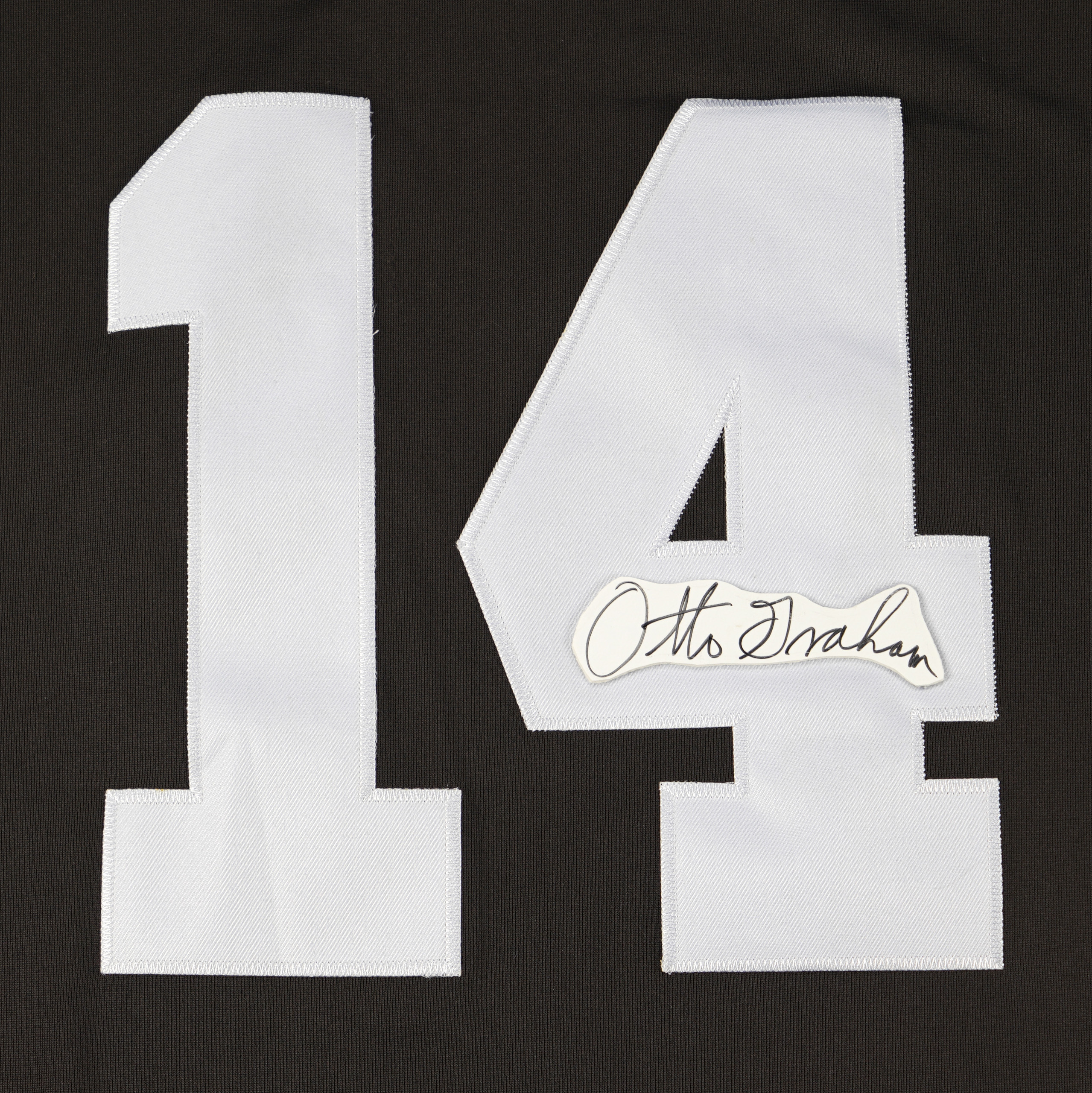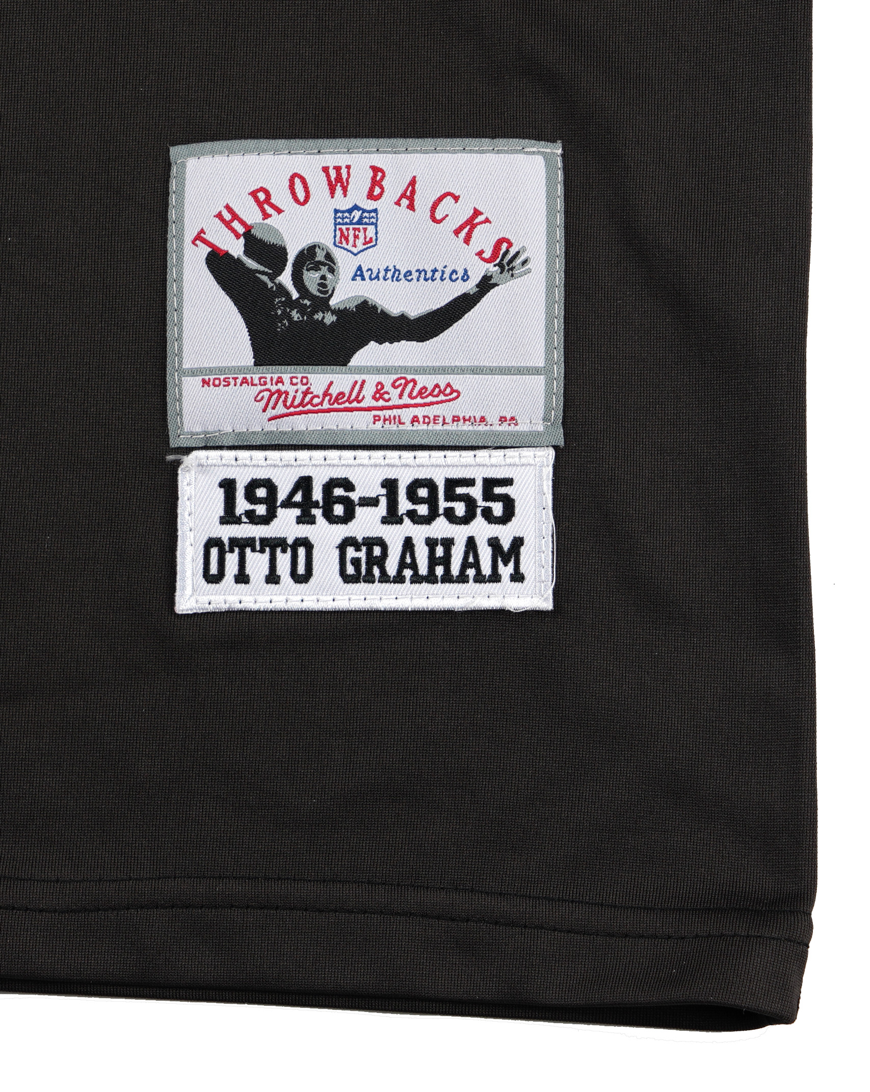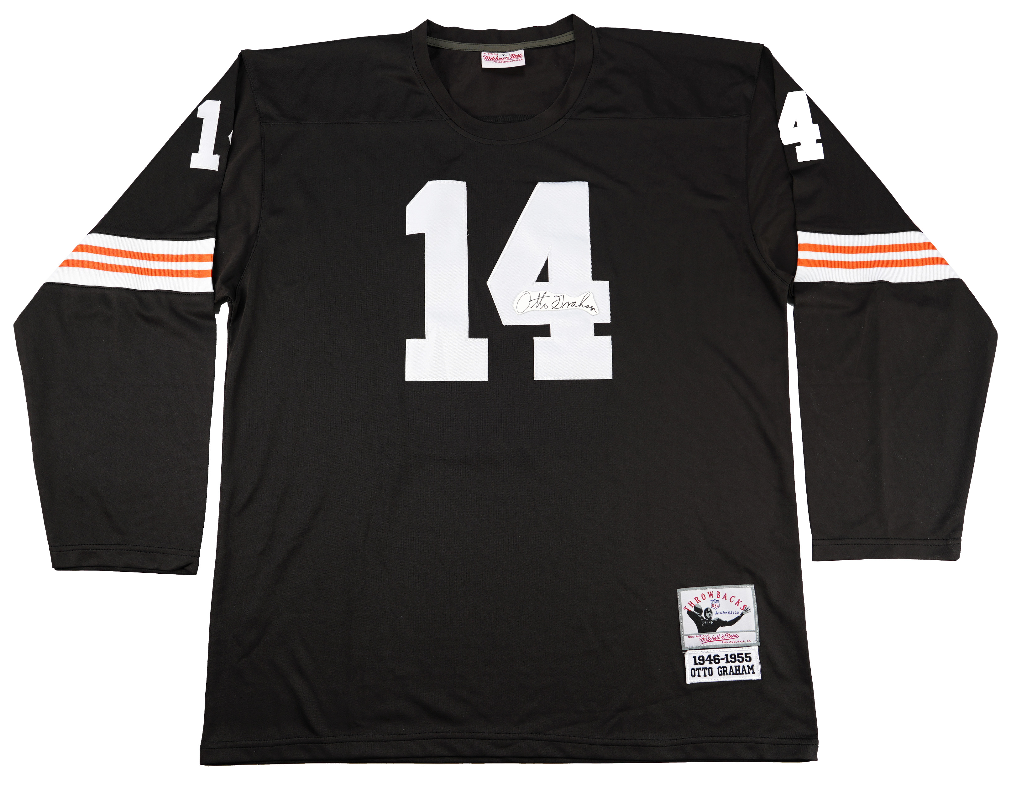 This Mitchell & Ness XL Throwback Jersey with “1946-1955 Otto Graham” tagging, has had a cut signature from a white panel of a signed football attached to the “4” in his number “14” on the front. The large signature grading (“9-10”) stands out on the white background.