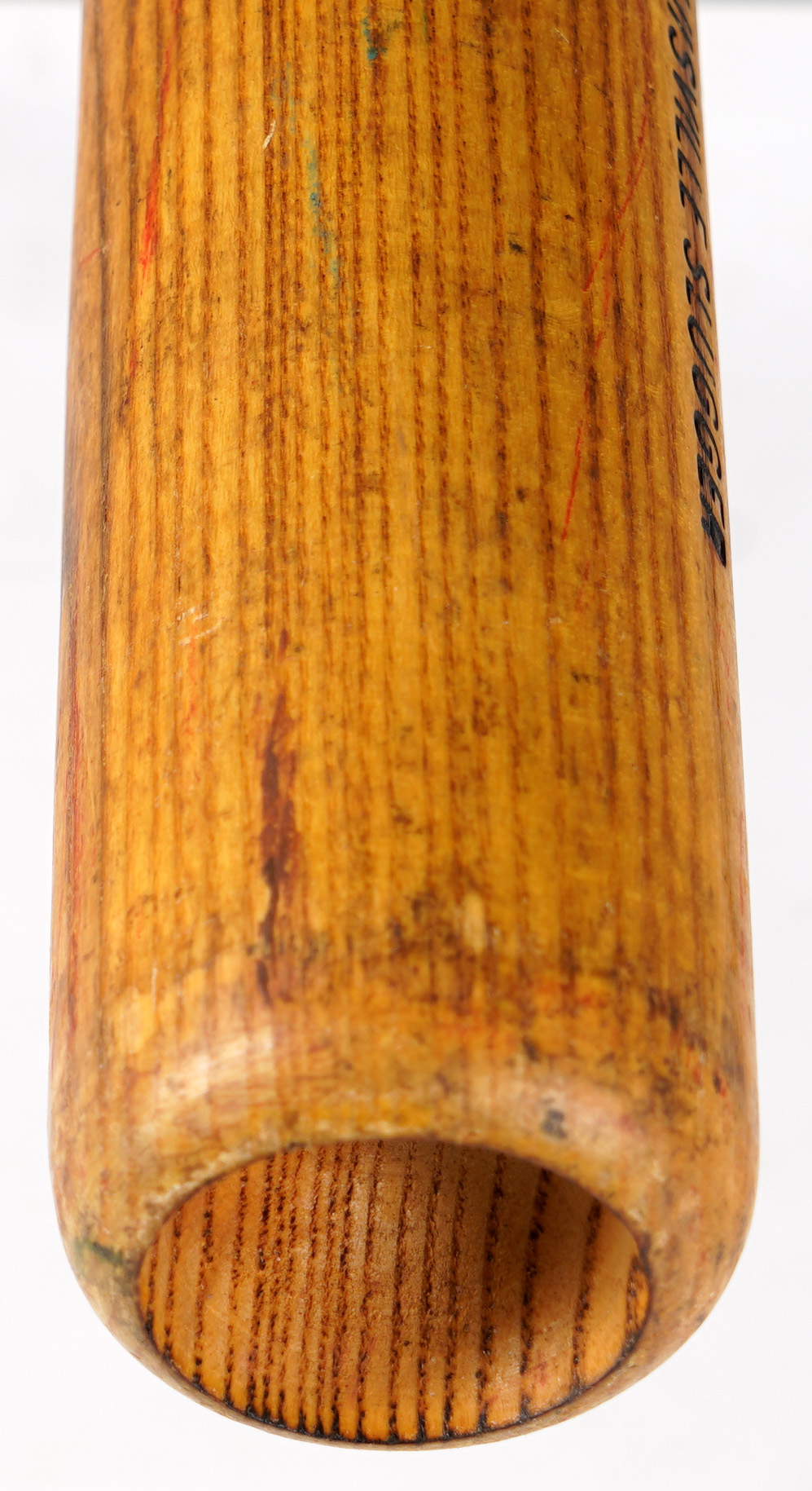 Johnny Bench Louisville Slugger signature-model bat ("B278") dating from the 1981-1983 manufacturing period. Graded GU 9 by PSA/DNA. The bat displays evidence of excellent use, including ball marks (with black-ink transfers), red and blue bat rack streaks, and a light coat of pine tar on the handle. Bench is considered by many to be the greatest catcher in baseball history. A two-time home-run champion and winner of two MVP Awards and ten consecutive Gold Glove Awards, Bench was elected to the Hall of Fame in 1989, his first year of eligibility. In 1999 he received his final honor when he was named as one of two catchers to baseball’s All-Century Team. Length: 35.25 inches. Weight: 32.8 ounces. Full LOA from John Taube of PSA/DNA. The size/weight of this item requires that there will be an additional shipping charge for this lot.