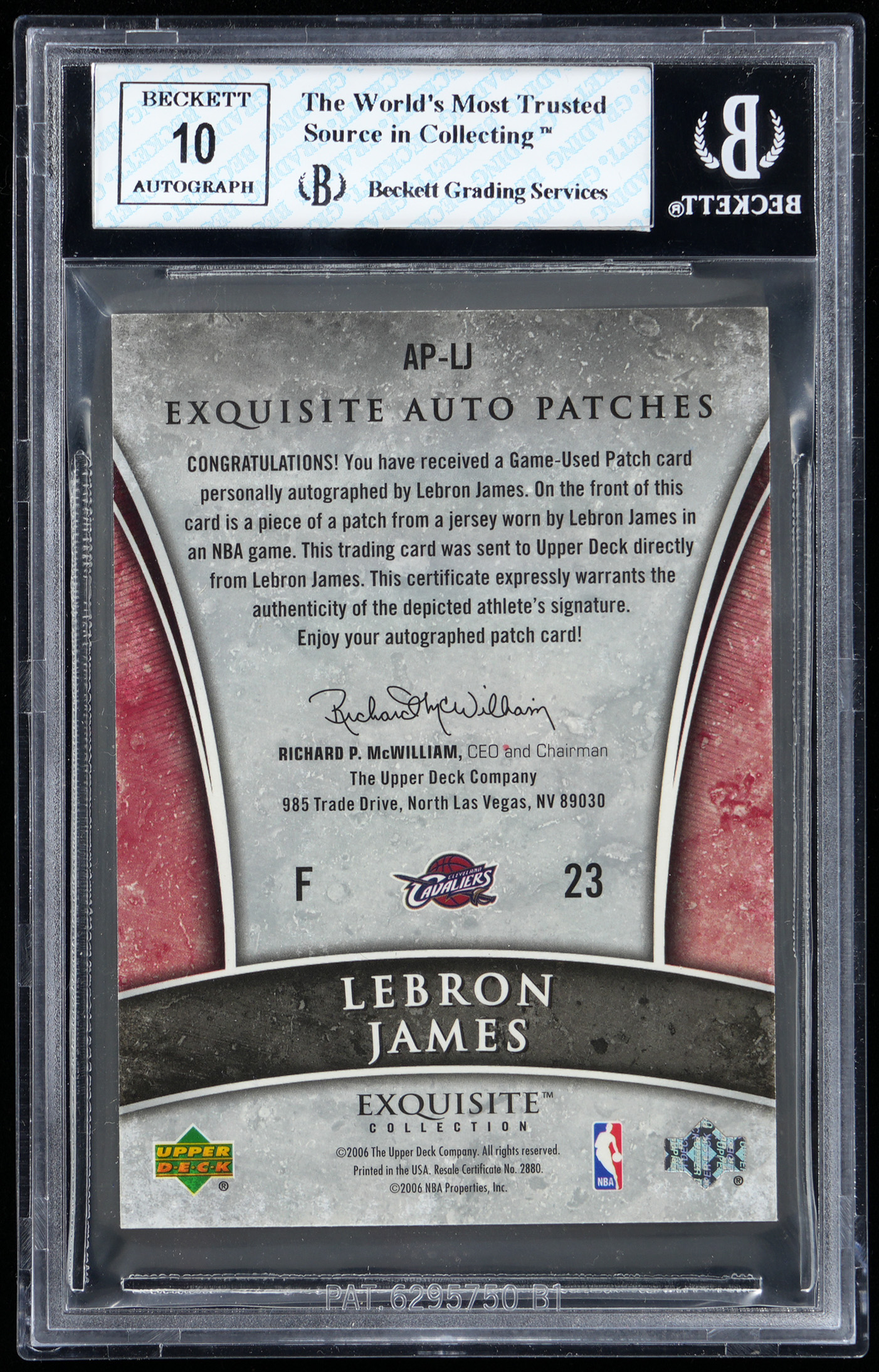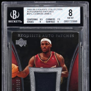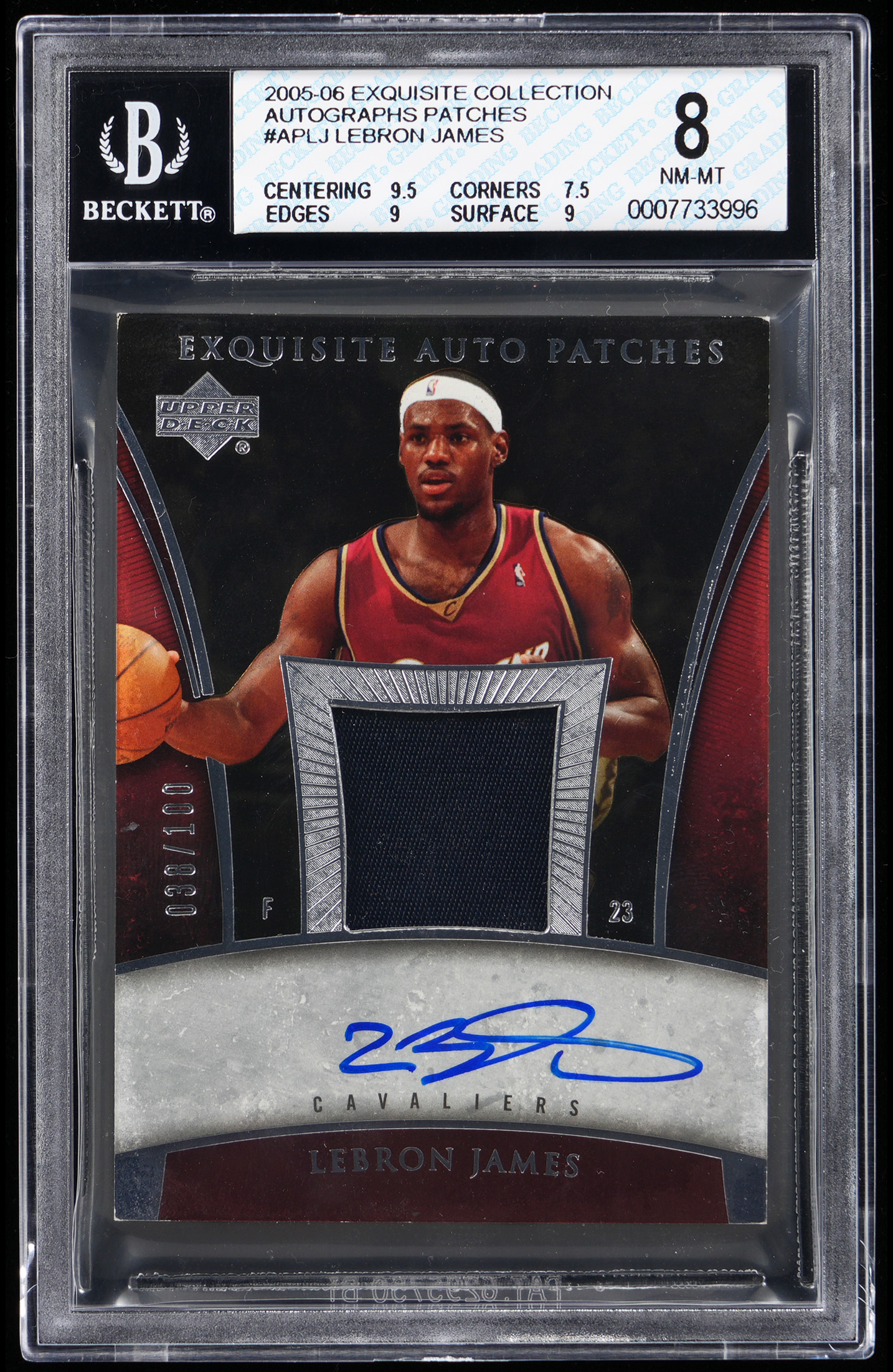 Graded NM-MT 8 by BGS with a "10" Autograph grade. Serially numbered #38/100. In the landscape of modern professional sports, if there was ever an athlete who could be termed a prodigy, it would be LeBron James. Since bursting onto the national scene at St. Vincent-St. Mary High School of Akron, the NBA's all-time scoring leader has taken the league and the three cities in which he has starred by storm. Four rings. Four MVP titles. The laundry list of career accomplishments is endless. The offered 2005-2006 Upper Deck Exquisite Collection Auto Patches LeBron James is a fitting tribute to the future Hall of Famer. This once-in-a-lifetime pull was inserted into an extremely limited five-card “pack” that routinely trades in the thousands. As such, imagine the thrill in pulling this collecting cornerstone?! The sub-grades for this truly impressive modern insert are as follows: Centering: 9.5; Corners: 7.5; Edges: 9 and Surface: 9.