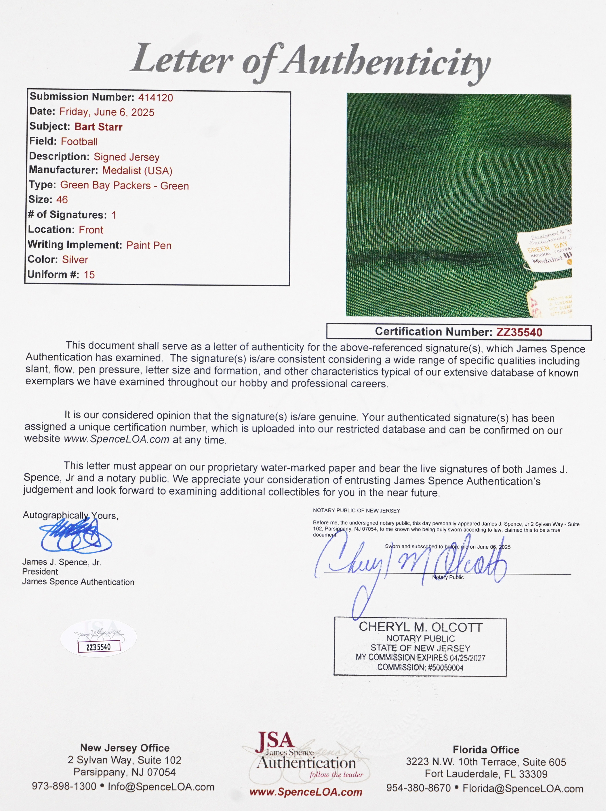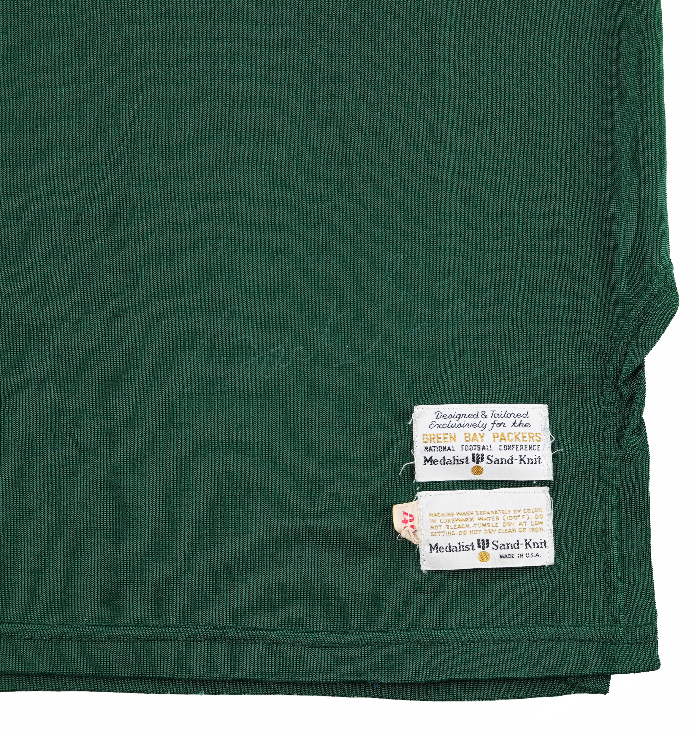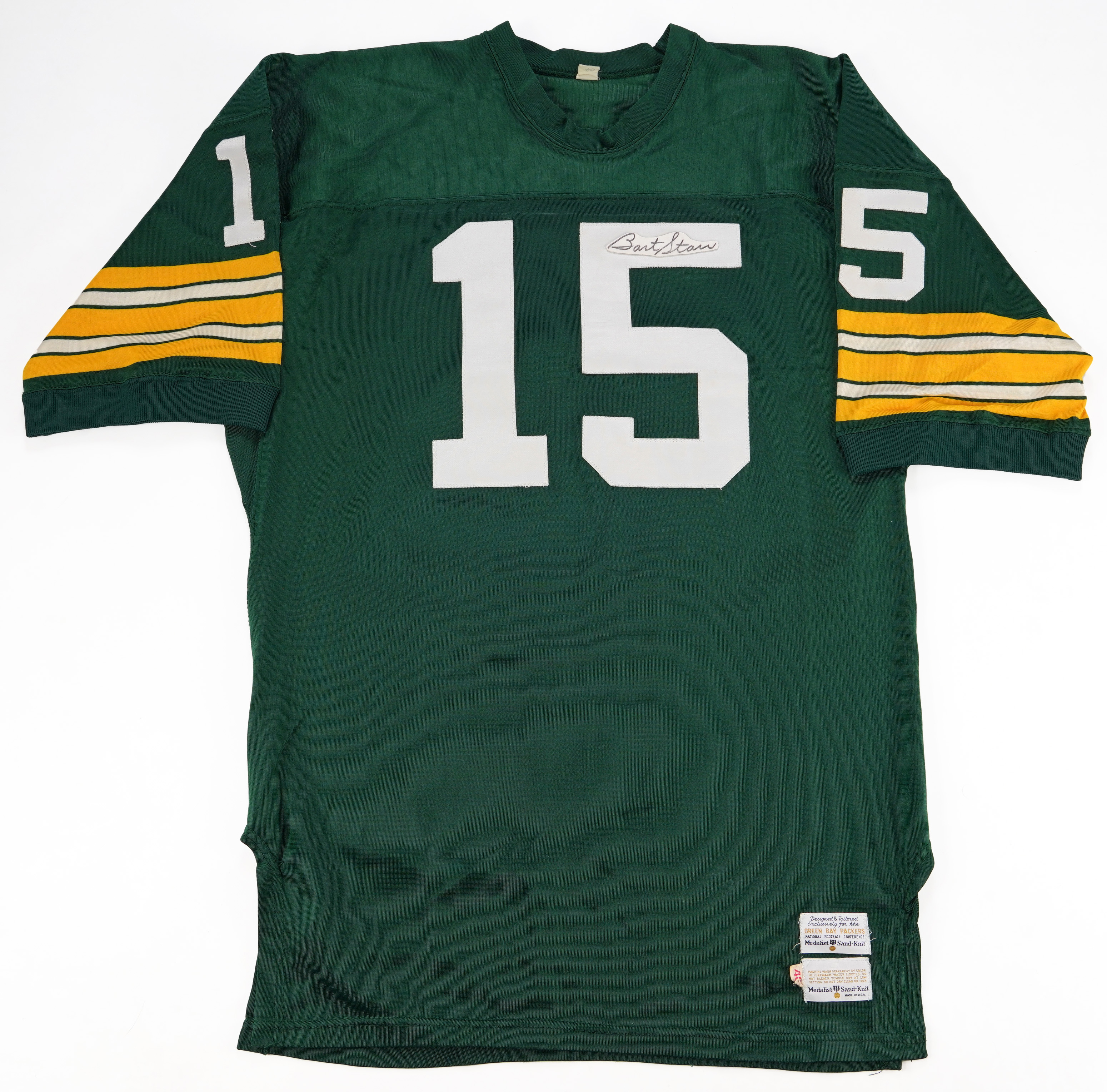 Bart Starr on size 48 green and white #15 Medalist SandKnit. Jersey also features a "standard" on-jersey signature ("5-6", faint) above the duo of Medalist tags near the front tail. Full JSA LOA