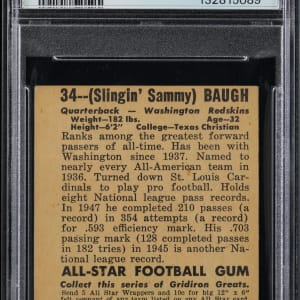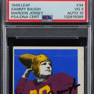 Signature judged Authentic by PSA/DNA and encapsulated by the grading service. (Slingin') Sammy Baugh applied his weighty pen to the offered 1948 Leaf Football #34 rookie card. This museum quality showpiece features the Washington Redskins quarterback via a "Maroon Jersey" variant. While the card is graded VG 3 by the grading service, Baugh's horizontal black Sharpie signature grades a perfect "10" in both strength and clarity. While Sammy Baugh autographs aren't very difficult to locate, such endorsements placed on rookie cards are decidedly scarce. Only 4 total examples of the player/pose variant have been judged by the authenticator!