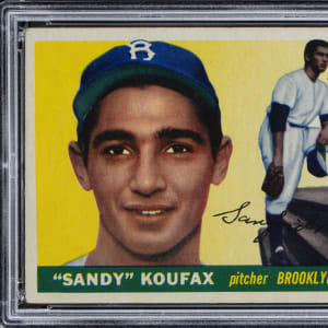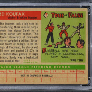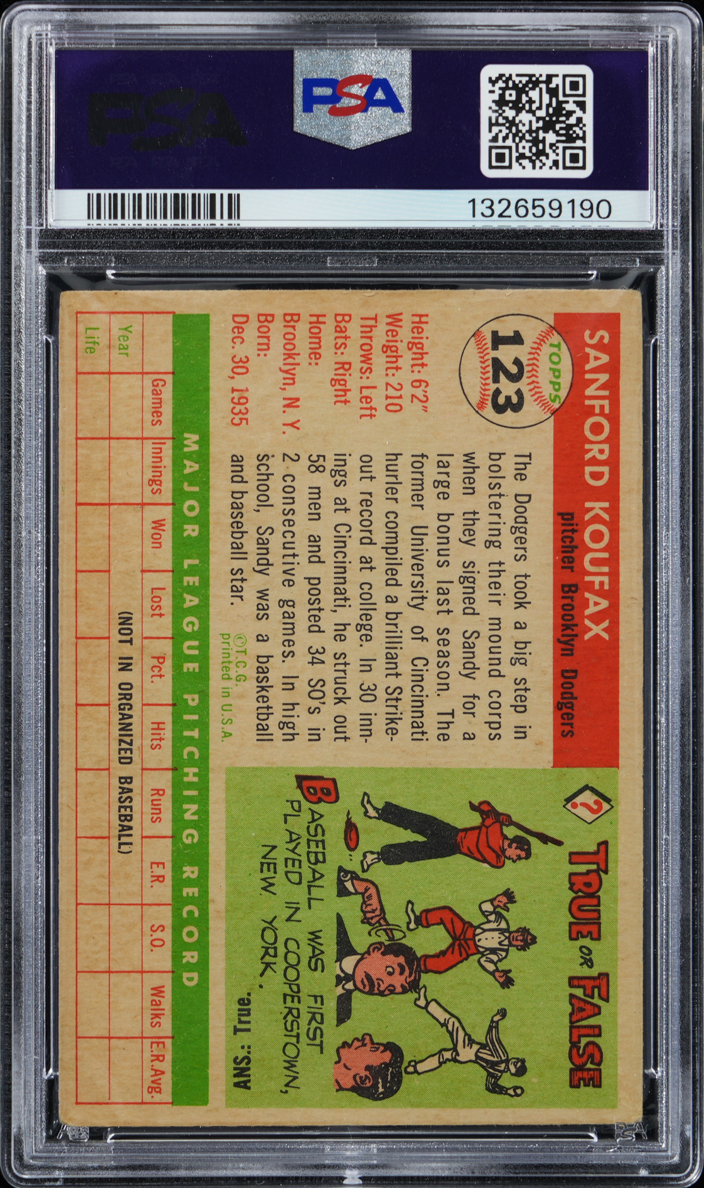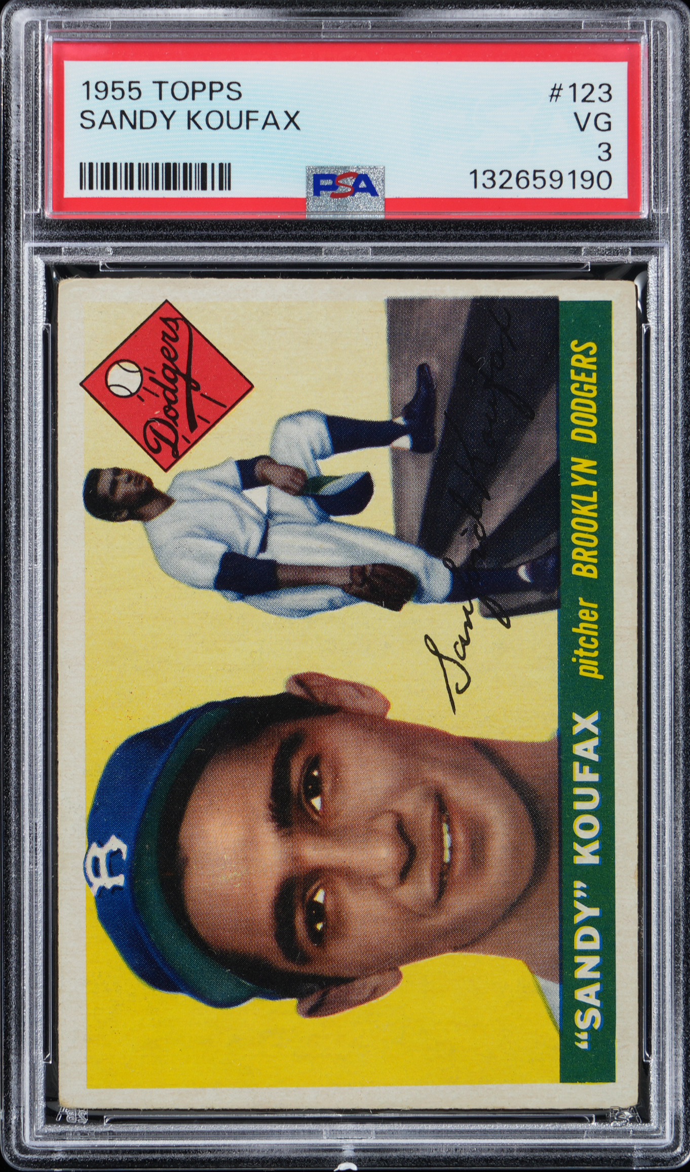 Graded VG 3 by PSA. Blazing 1955 Topps #123 Sandy Koufax rookie card. This premiere of the future Brooklyn Dodgers ace is crease-free with striking surface colors and a clean "True or False" back. A "new to hobby" example that presents at the zenith of its overall evaluation!