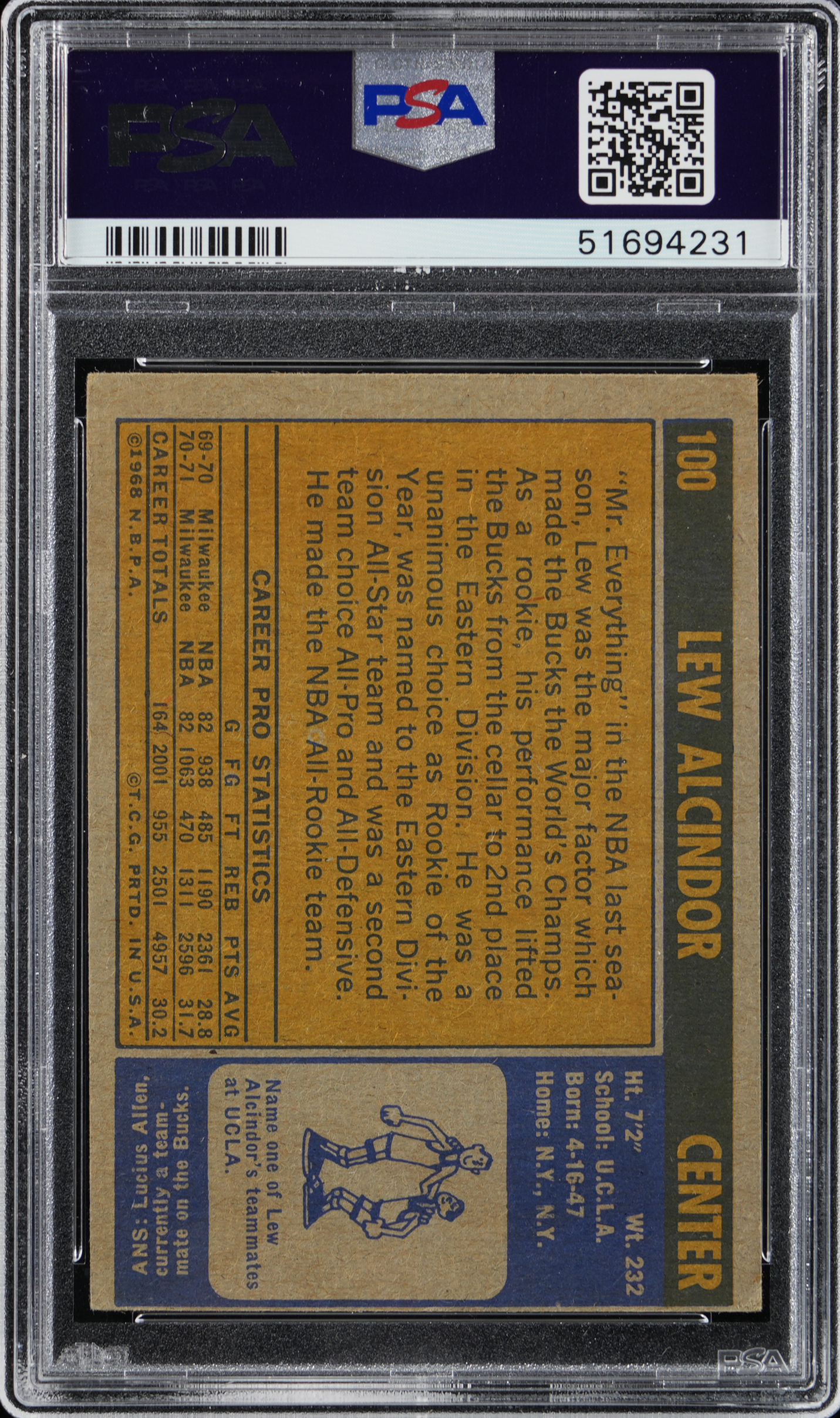 Graded VG 3 by PSA. Milwaukee Bucks Hall of Famer Lew Alcindor (the future Kareem Abdul-Jabbar).