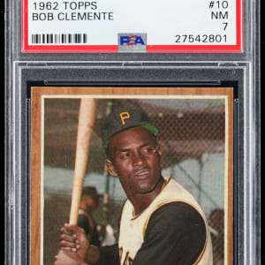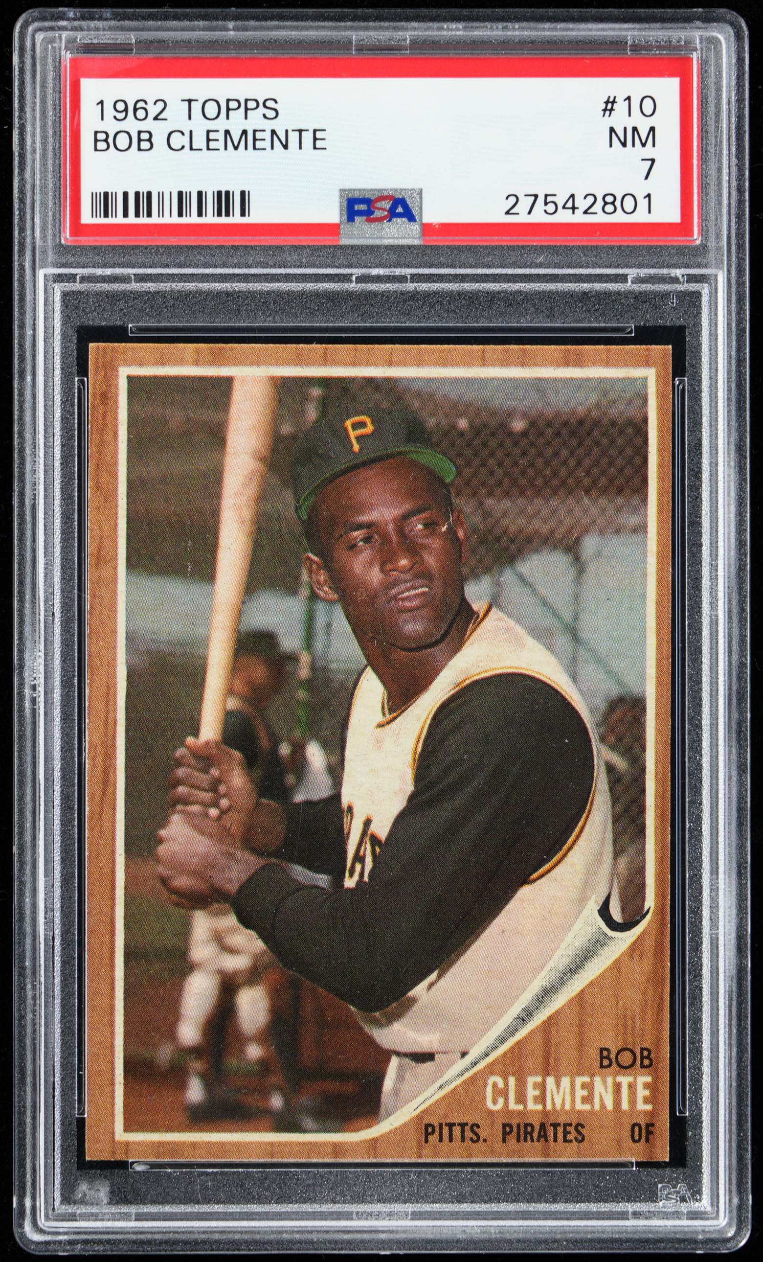 Graded NM 7 by PSA. Sold 1962 Topps #10 Roberto Clemente. Pittsburgh Pirates Hall of Famer.