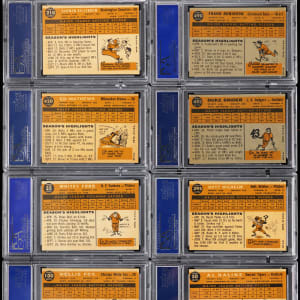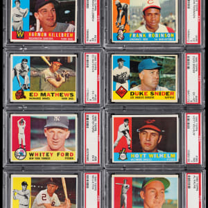 Each graded from EX 5 to NM 7 by PSA. Crisp compilation of (8) 1960 Topps Hall of Famers. Includes: PSA NM 7: #395 Wilhelm; PSA EX-MT 6: (4 cards) with #50 Kaline, #100 Fox, #420 Mathews, #493 Snider; PSA EX 5: (3 cards) with #35 Ford, #210 Killebrew and #490 F. Robinson.