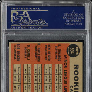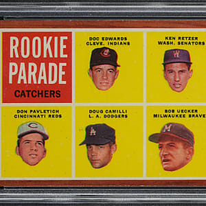 Graded NM 7 by PSA. A Hall of Fame sportscaster who was far better as a broadcaster than a ball player is found on the offered 1962 Topps #594 Rookie Parade high number. This crisp "floating head" portrait of Bob Uecker and his fellow backstops is well centered with four sharp corners, unchipped wooden edges and lush surface colors.