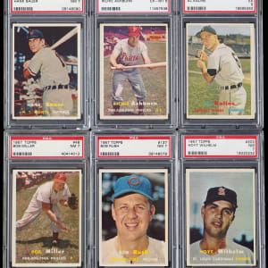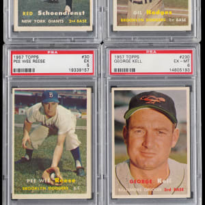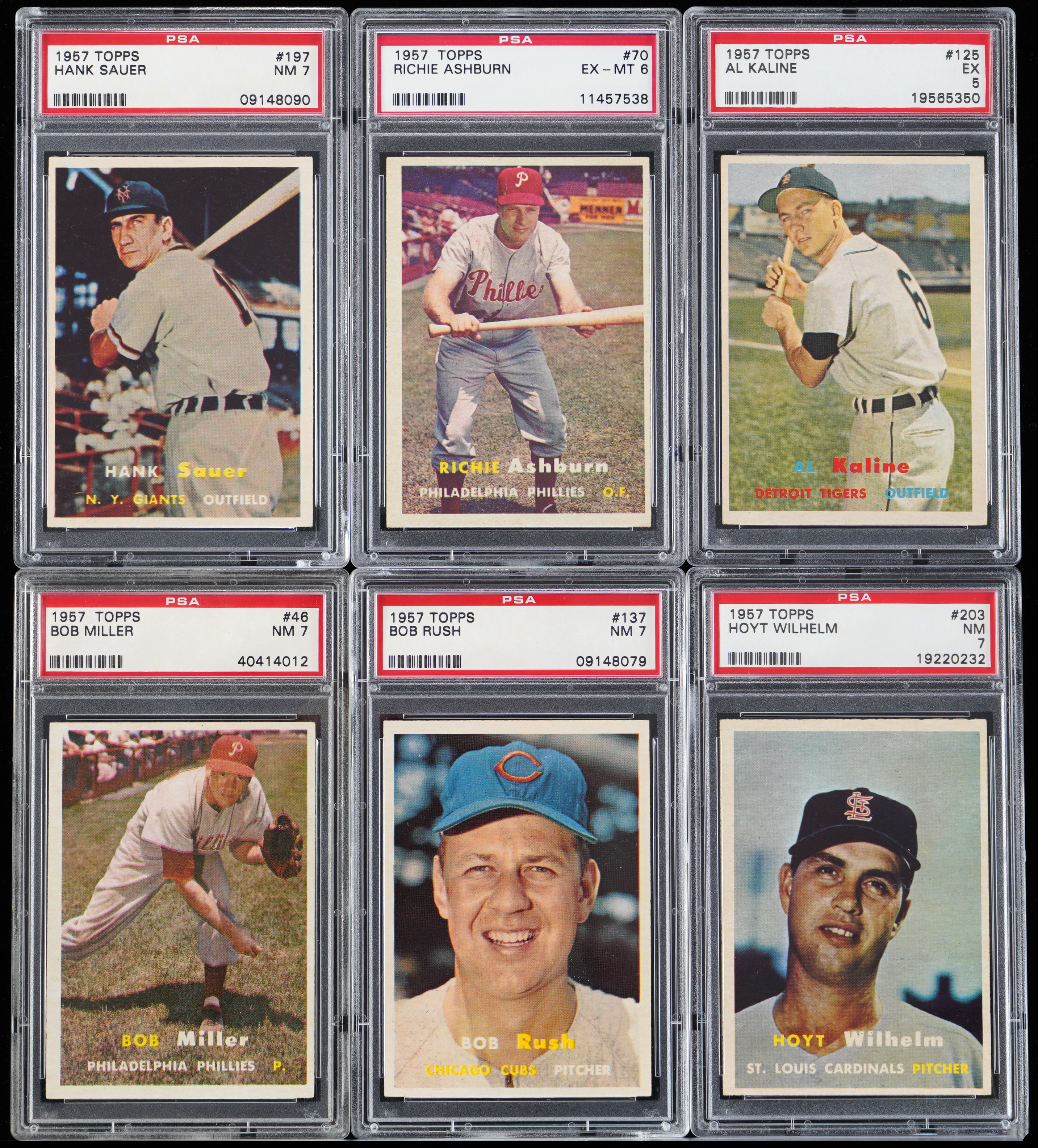 Each graded from EX 5 to NM 7 by PSA. Big-time collection of (10) key 1957 Topps Hall of Famers and stars. Includes: PSA NM 7: (4 cards) with #46 B. Miller, #137 Rush, #197 Sauer, #203 Wilhelm; PSA EX-MT 6: (4 cards) with #70 Ashburn, #80 Hodges, #154 Schoendienst, #230 Kell; PSA EX 5: (2 cards) with #30 Reese and #125 Kaline.