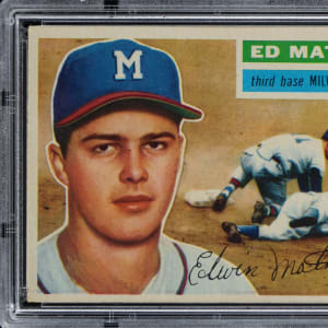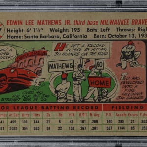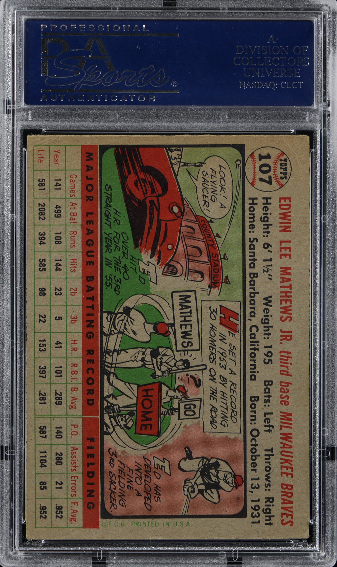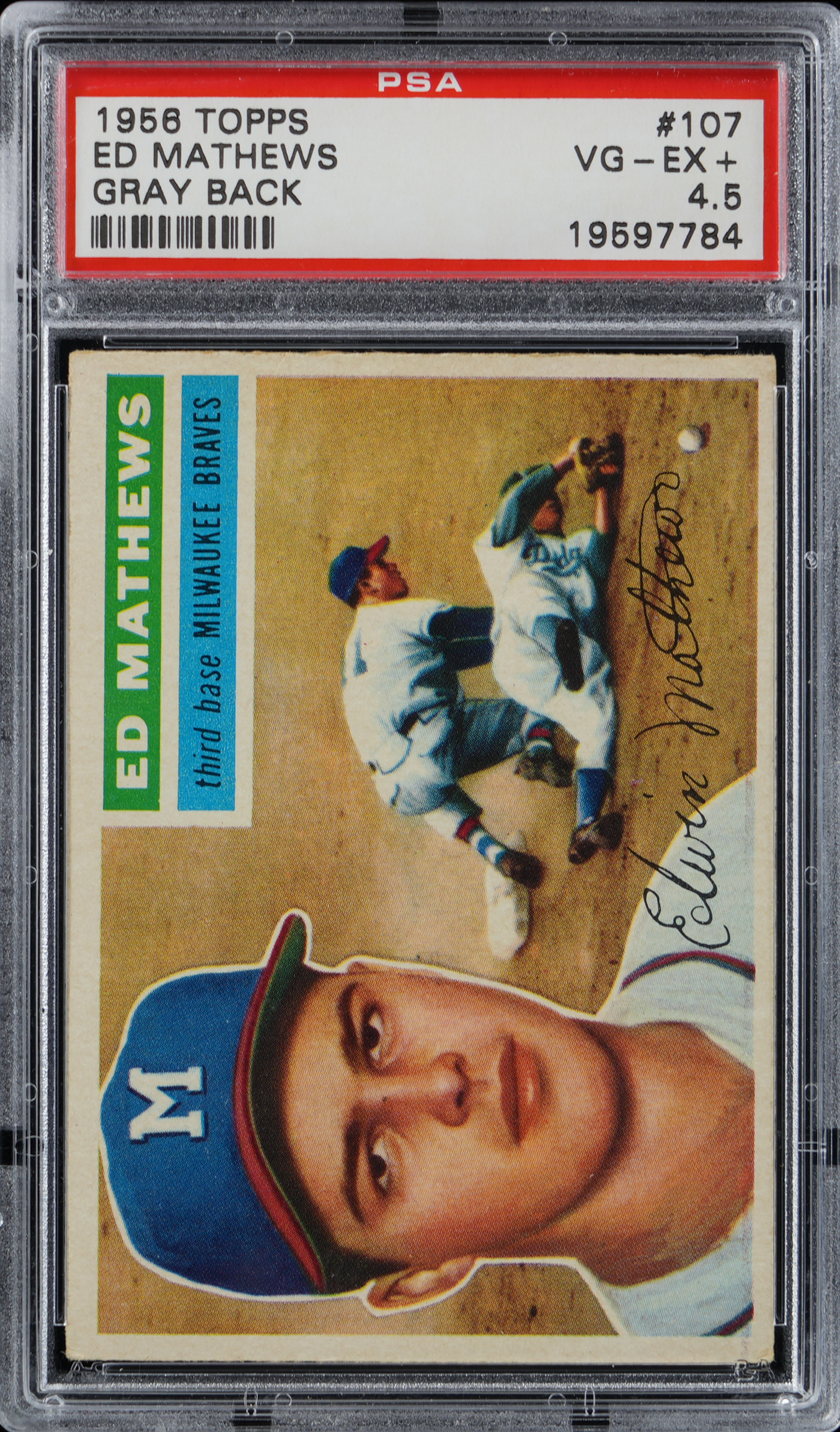 Graded VG-EX+ 4.5 by PSA. Milwaukee Braves Hall of Fame third baseman Eddie Mathews. Gray back version.