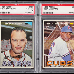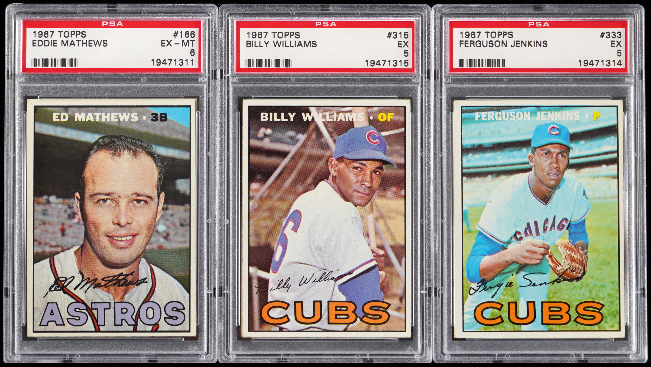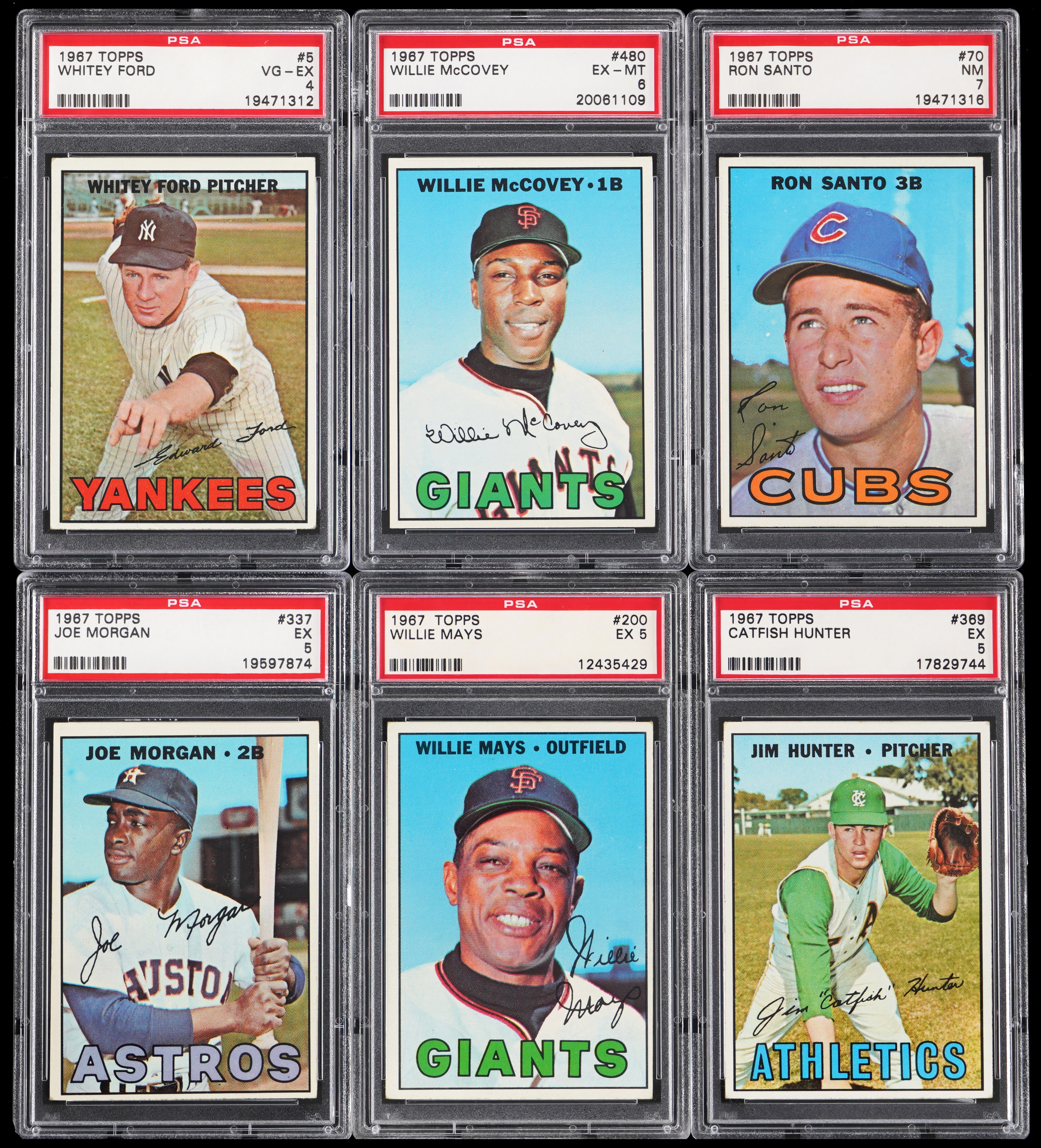 Each graded by PSA. Boost your 1967 Topps standing with these nine Hall of Famers. Includes: PSA NM 7: #70 Santo; PSA EX-MT 6: (2 cards) with #166 Mathews, #480 McCovey; PSA EX 5: (5 cards) with #200 Mays, #315 B. Williams, #333 Jenkins, #337 Morgan, #369 Hunter and PSA VG-EX 4: #5 Ford.