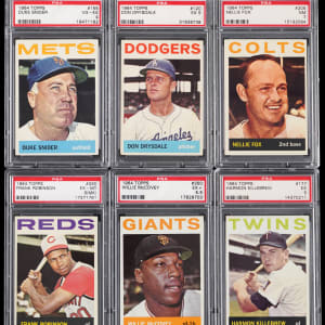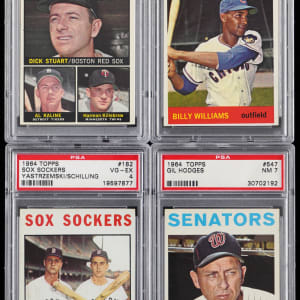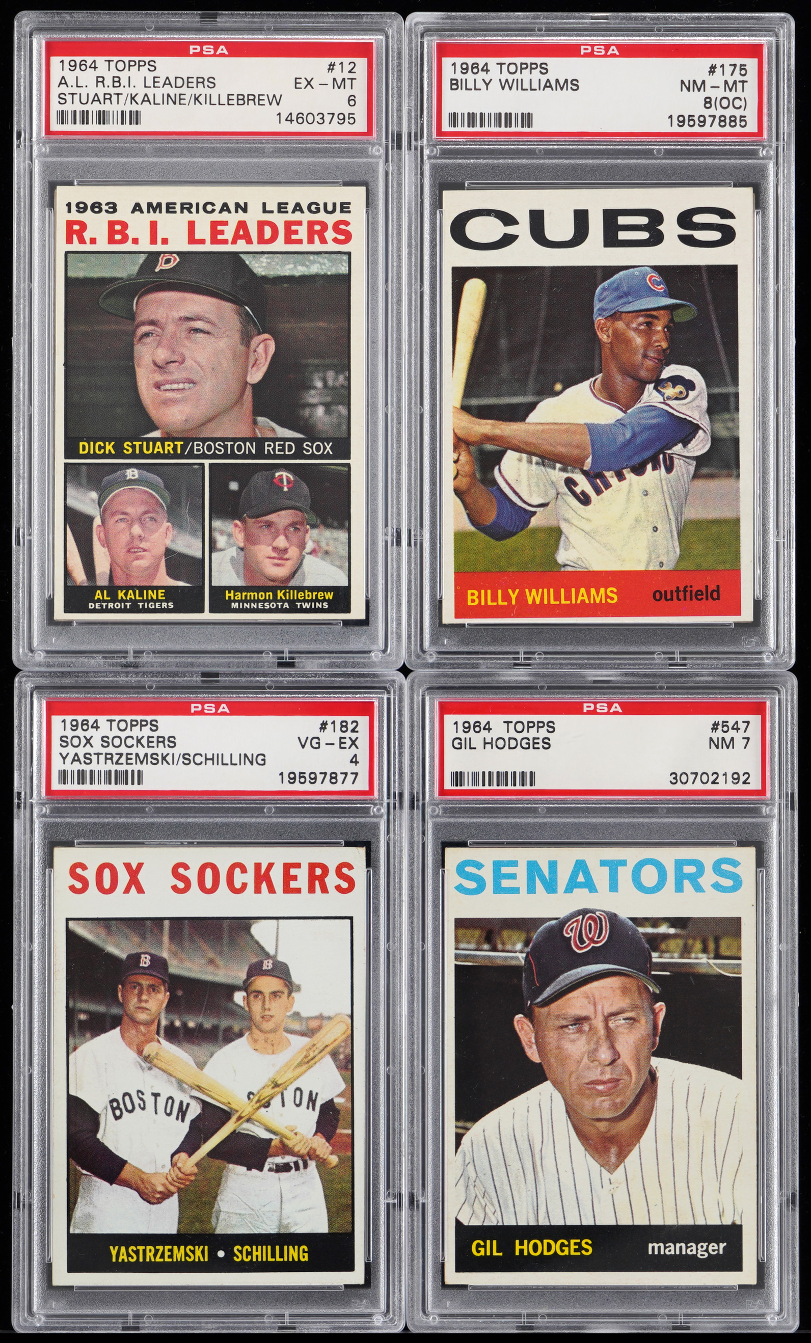 Each graded by PSA. Supplement your 1964 Topps project with these (10) different Hall of Famers. Includes: PSA NM-MT 8: #175 B. Williams (oc); PSA NM 7: (2 cards) with #205 Fox, #547 Hodges; PSA EX-MT 6: (2 cards, includes one qualifier) with #12 Kaline/Killebrew LL, #260 F. Robinson (mk); PSA EX+ 5.5: #350 McCovey; PSA EX 5: (2 cards) with #120 Drysdale, #177 Killebrew; PSA VG-EX 4: (2 cards) with #155 Snider and #182 Yastrzemski/Schilling.