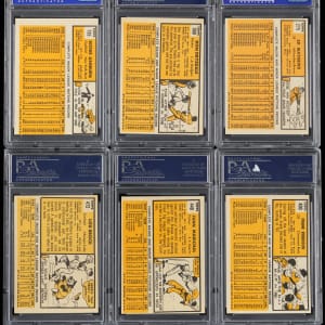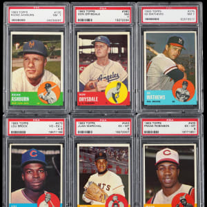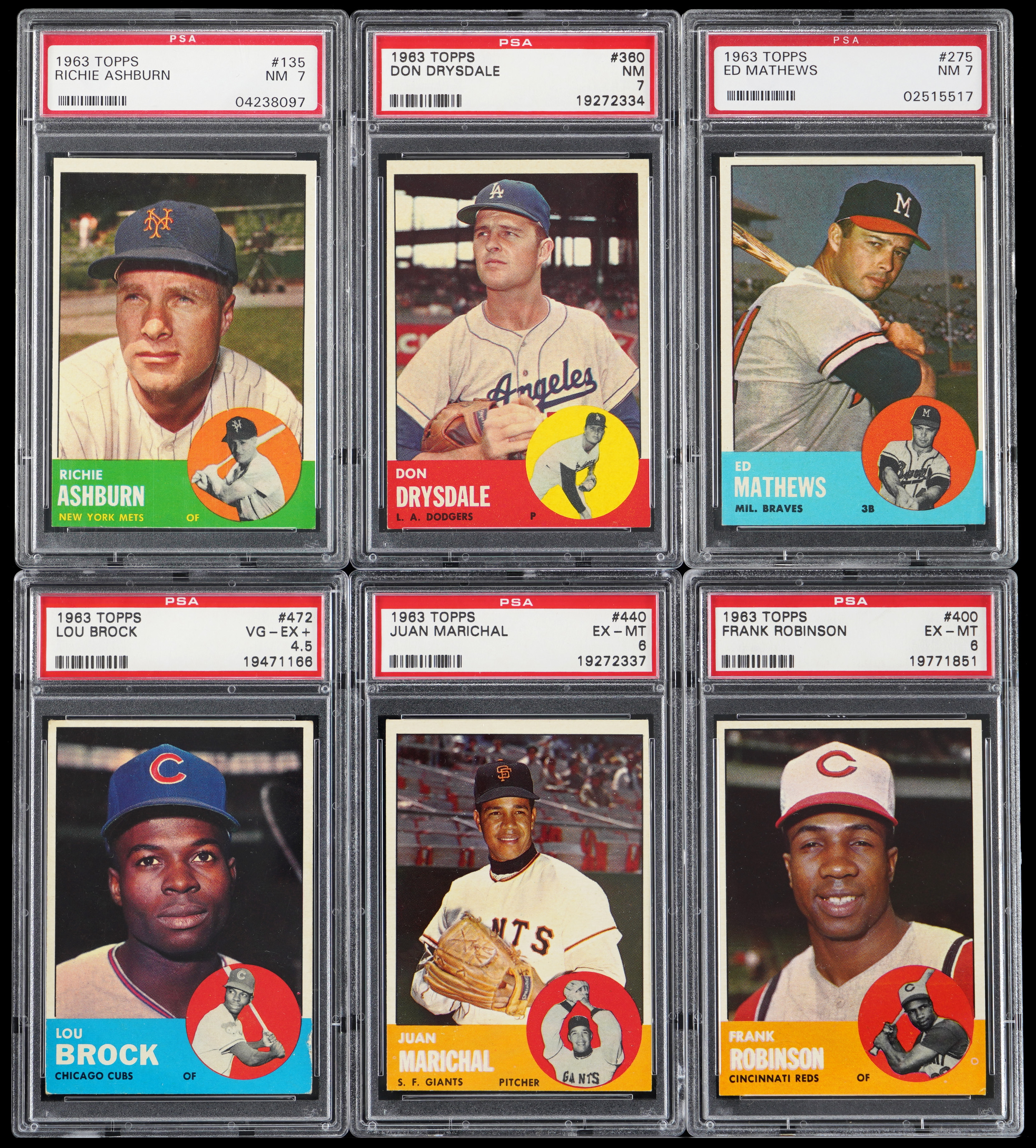 Each graded by PSA. National League superstars reign with these six 1963 Topps Hall of Famers. Includes: PSA NM 7: (3 cards) with #135 Ashburn, #275 Mathews, #360 Drysdale; PSA EX-MT 6: (2 cards) with #400 F. Robinson, #440 Marichal and PSA VG-EX+ 4.5: #472 Brock.