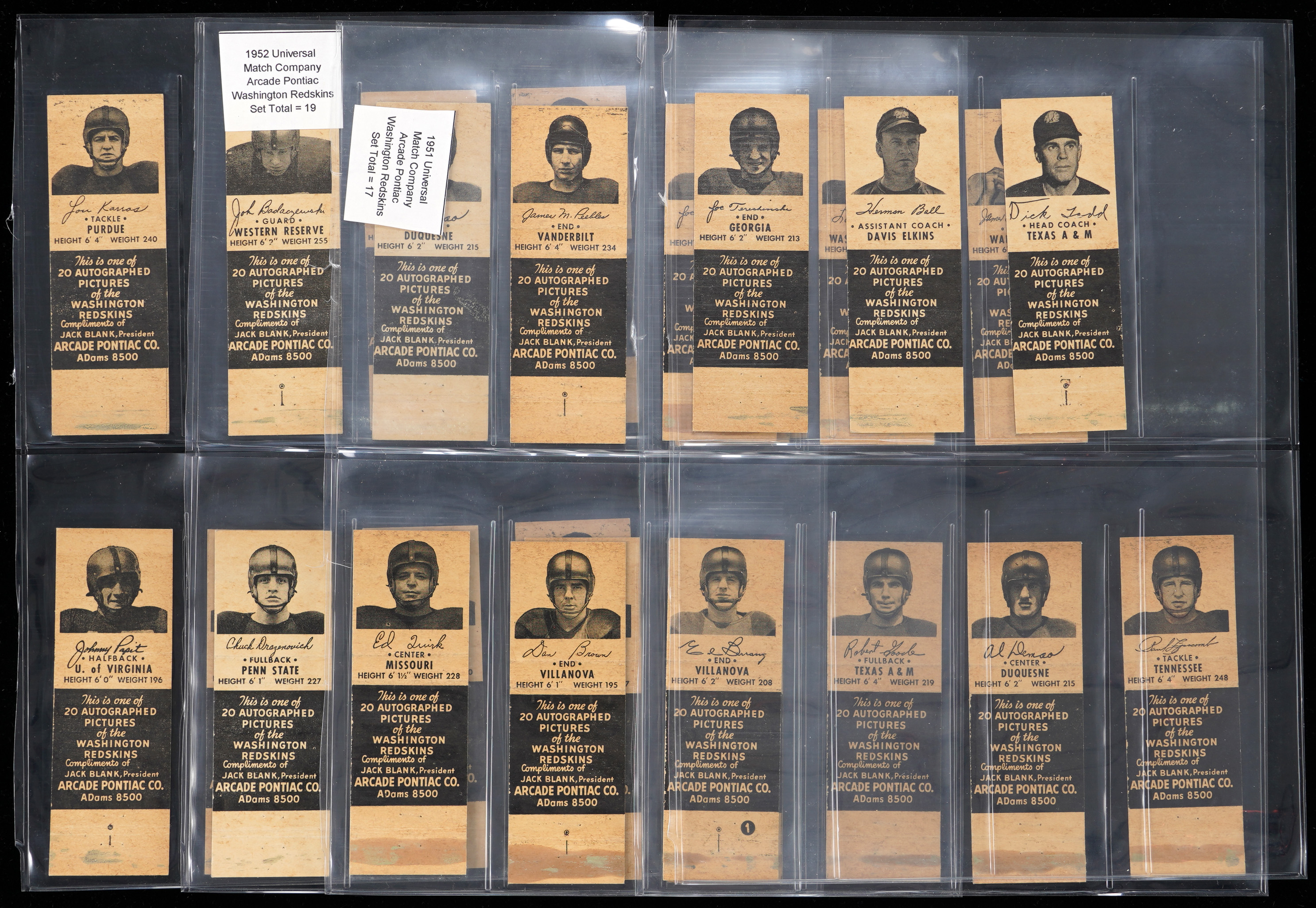 Double team the offered pair of 1951 and 1952 Washington Redskins Arcade Pontiac Matchbook Covers complete sets. Each D.C. player has retained its original striker. Each issue was manufactured by Universal Match Company and sponsored by the automobile dealership. Highlights include: