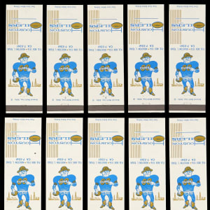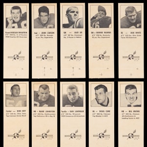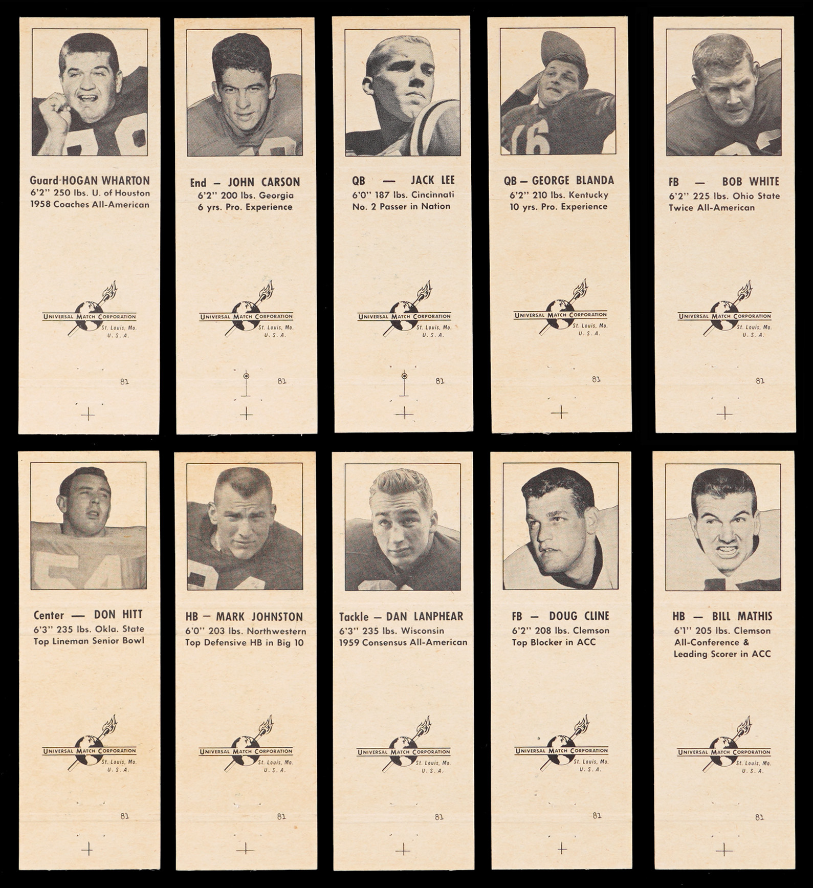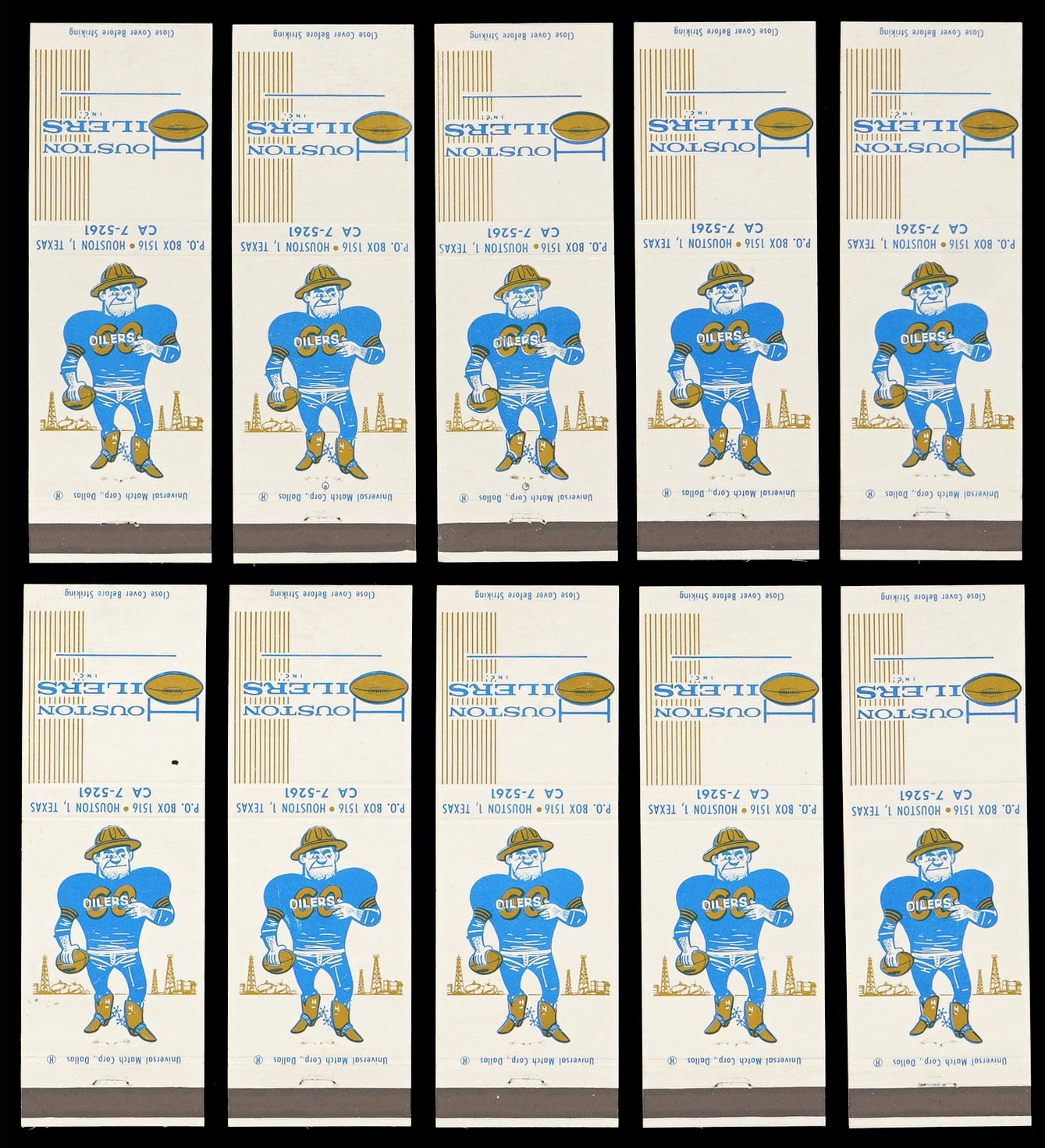 The offered 1960 Universal Matchbooks Houston Oilers complete set of (10) covers pictures the AFL upstarts in their inaugural season. These roughnecks average (NM to NM-MT) condition with crisply attached strikers. Includes: Blanda (NM-MT), Carson, Cline, Hitt, Johnston, Lanphear, Lee, Mathis, Wharton and B. White.