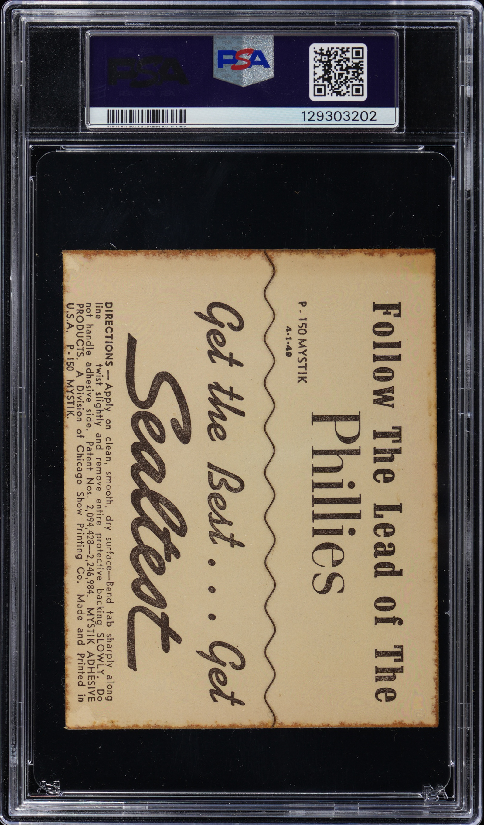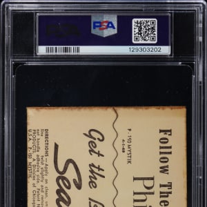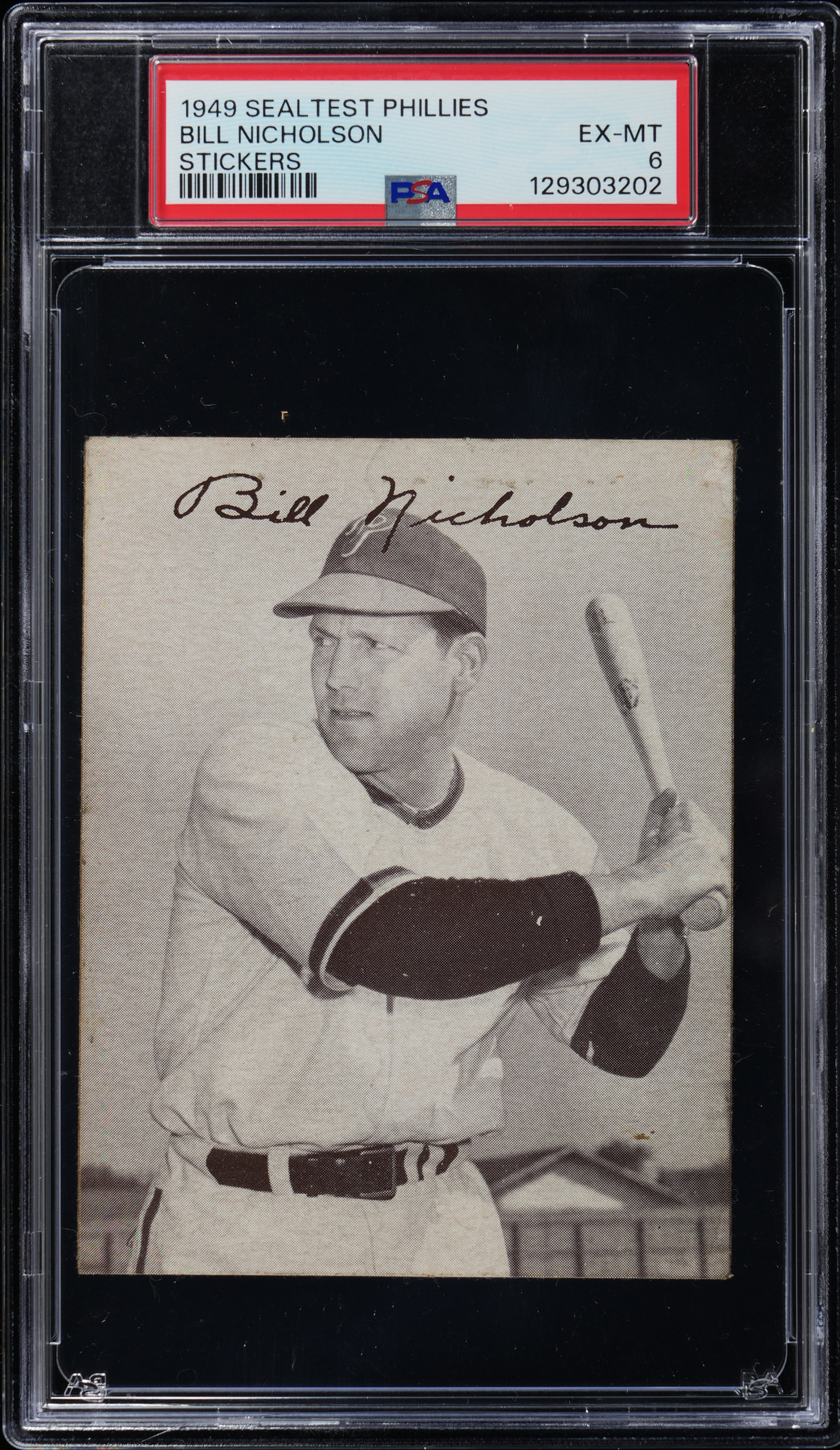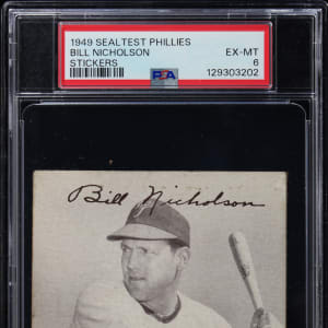 Graded EX-MT 6 by PSA. Scarce 1949 Sealtest Phillies Stickers Bill Nicholson example. This black-and-white action pose measures 3-1/2 x 4-1/4" and pictures "Swish" as he studies an incoming pitch. Of the 19 total examples judged by PSA, this regional survives as 1 of 6 at the grading level with only one higher.