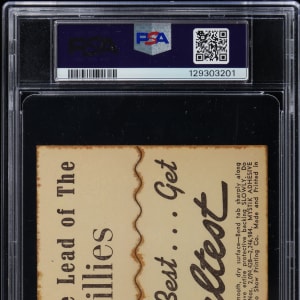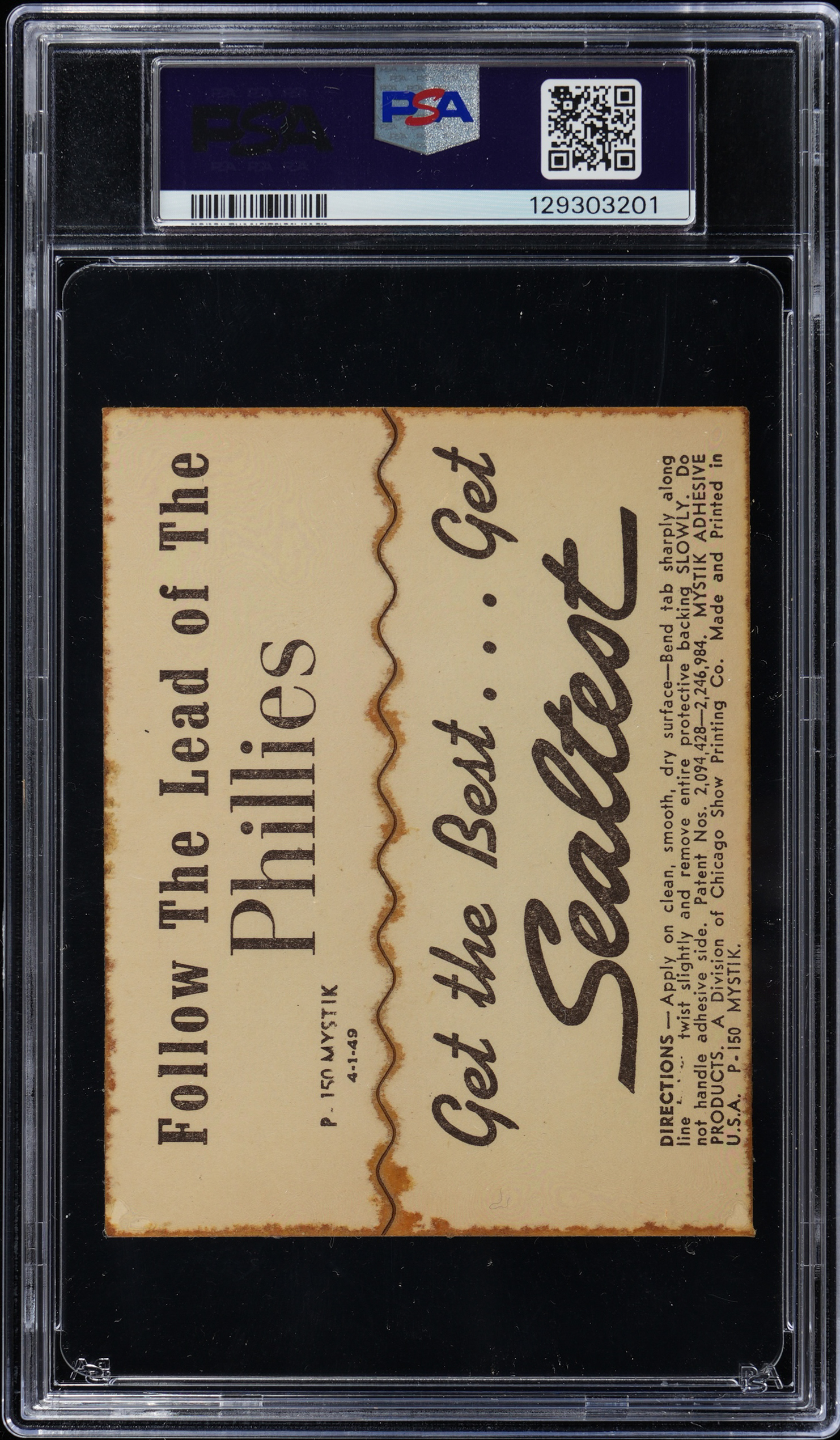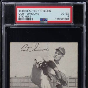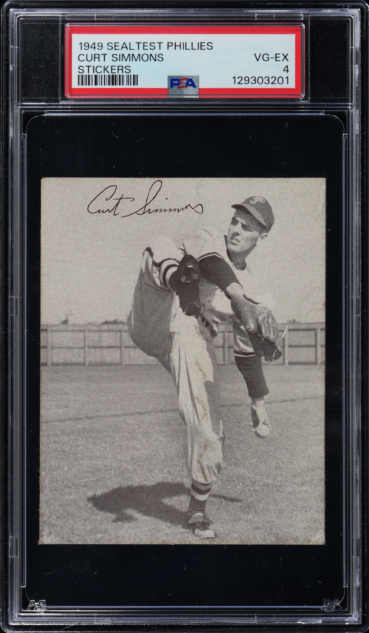 Graded VG-EX 4 by PSA. "Whiz Kid" anchor Curt Simmons leads the way with the offered 1949 Sealtest Phillies sticker. This black-and-white action pose measures 3-1/2 x 4-1/4" and pictures the three-time All-Star as he unleashes a dizzying pitch. Of the 20 total examples judged by PSA, this regional survives as 1 of 3 at the grading level with six higher.