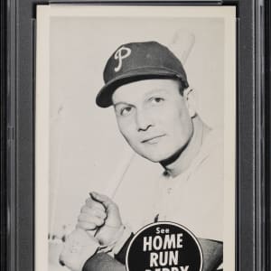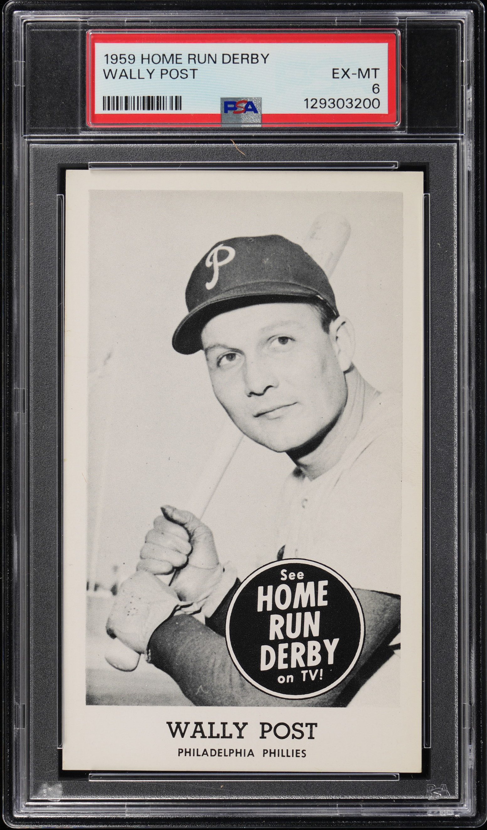 Graded EX-MT 6 by PSA. Produced by American Motors to promote the television program hosted by Mark Scott (whose heart attack in July 1960 effectively ended the show), the 1959 Home Run Derby issue is highly prized among oddball specialists. The offered example pictures Philadelphia Phillies star Wally Post.