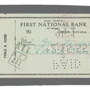 Bank an autograph from one of baseball’s all-time greatest stars, when you acquire this Ty Cobb (HOF, d.1961) signed personal check. Dated 2/11/55, this First National Bank of Nevada check is adhered to a rigid backer measuring 9” x 4”. Cobb’s name is printed at left and he has filled out the details in his trademark green ink. Located on the customary endorsement line at bottom-right, Cobb’s signature reports as a potent example.