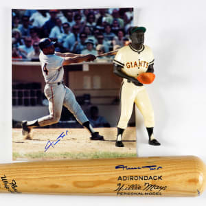 Trio of classic Willie Mays items, two of which have been signed by the legendary San Francisco Giants Hall of Famer. This trio consists of the following: 1) 1958-1963 Hartland Statue (a small surface impression is visible just above the belt on the reverse, in Excellent condition overall). 2) Signed Adirondack Willie Mays Model Bat (blue ink). 3) Signed 8 x 10 color photograph (blue ink). The collection would make a worthy addition to any Willie Mays collection. Auction LOA from James Spence/JSA for the signed bat and photograph. The size/weight of this item requires that there will be an additional shipping charge for this lot.