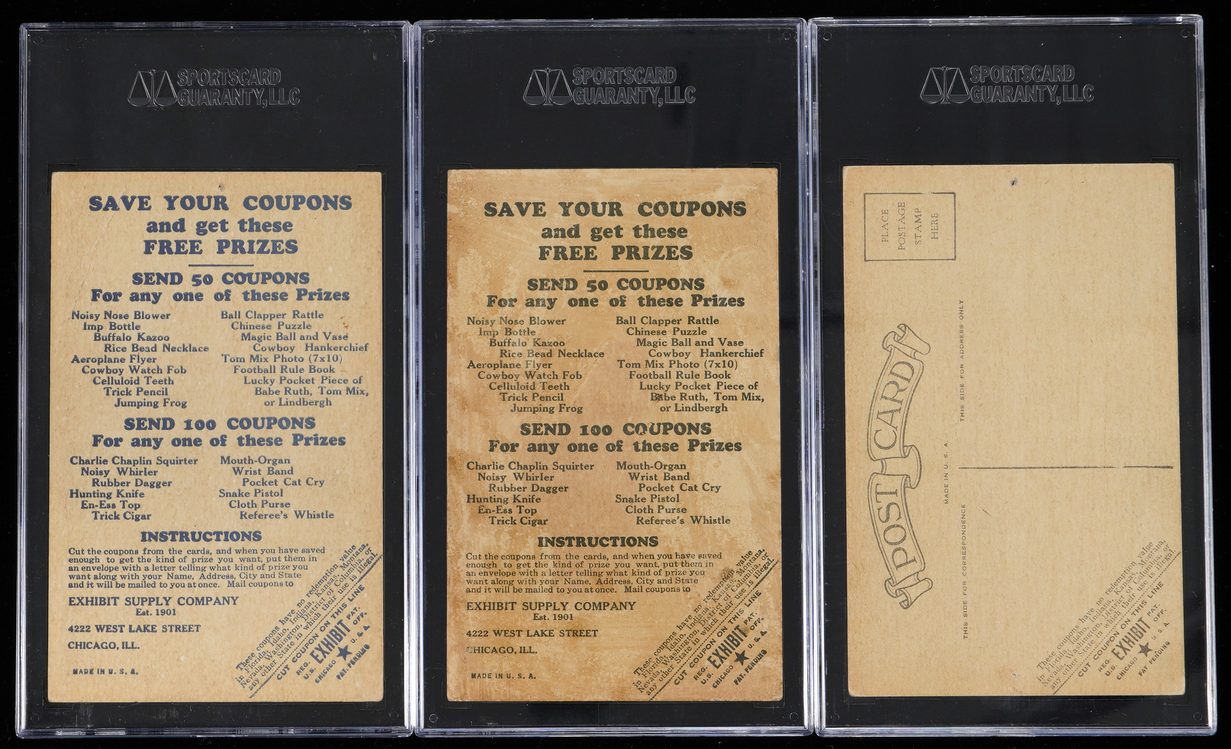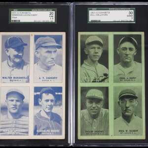 Each graded by SGC. Timeless teams are captured with the offered trio of 1929-1932 Four-in-One Exhibits with coupon backs. Each formidable foursome showcases a Hall of Famer. Includes: 1929-1930 Exhibits Postcard Back: Goslin/Bluege/Ruel/Judge (SGC POOR 1); 1931-1932 Exhibits: (2 cards) with Hallahan/Hafey/Douhit/Gilbert (SGC GOOD 2) and Maranville/Zachary/Spohrer/R. Moore (SGC FAIR 1.5).