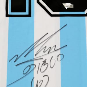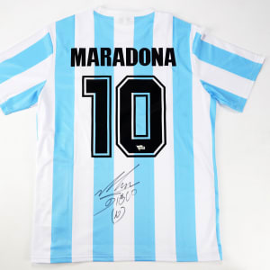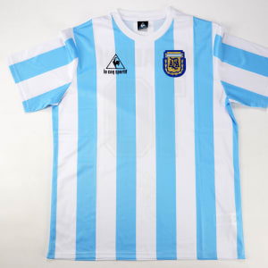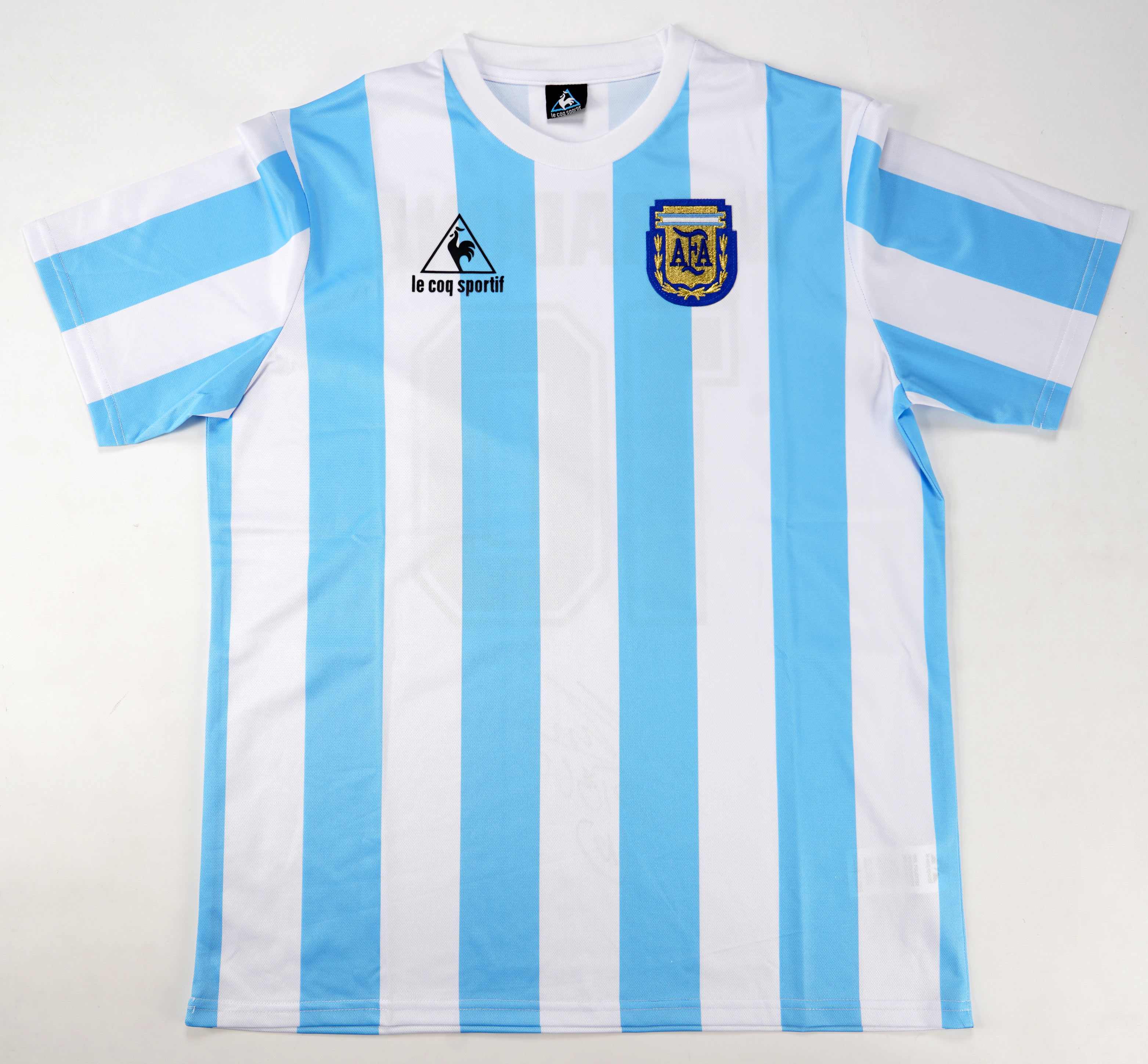 Diego Armando Maradona captained Argentina during their 1986 World Cup winning run, scoring two of the most famous goals in the tournament's history in that edition. During this historic tournament, the Argentine side wore kits produced by French outfitter Le Coq Sportif. Offered is a Argentina National Team jersey (size XL), similarly styled to those worn by the champions during 1986 World Cup play. The value of this handsome shirt is greatly amplified by a large signature provided by the legendary Argentine captain, located on the back, below the numbering. The sky-blue and white striped top bears a Fanatics hologram sticker, and a Fanatics COA accompanies.