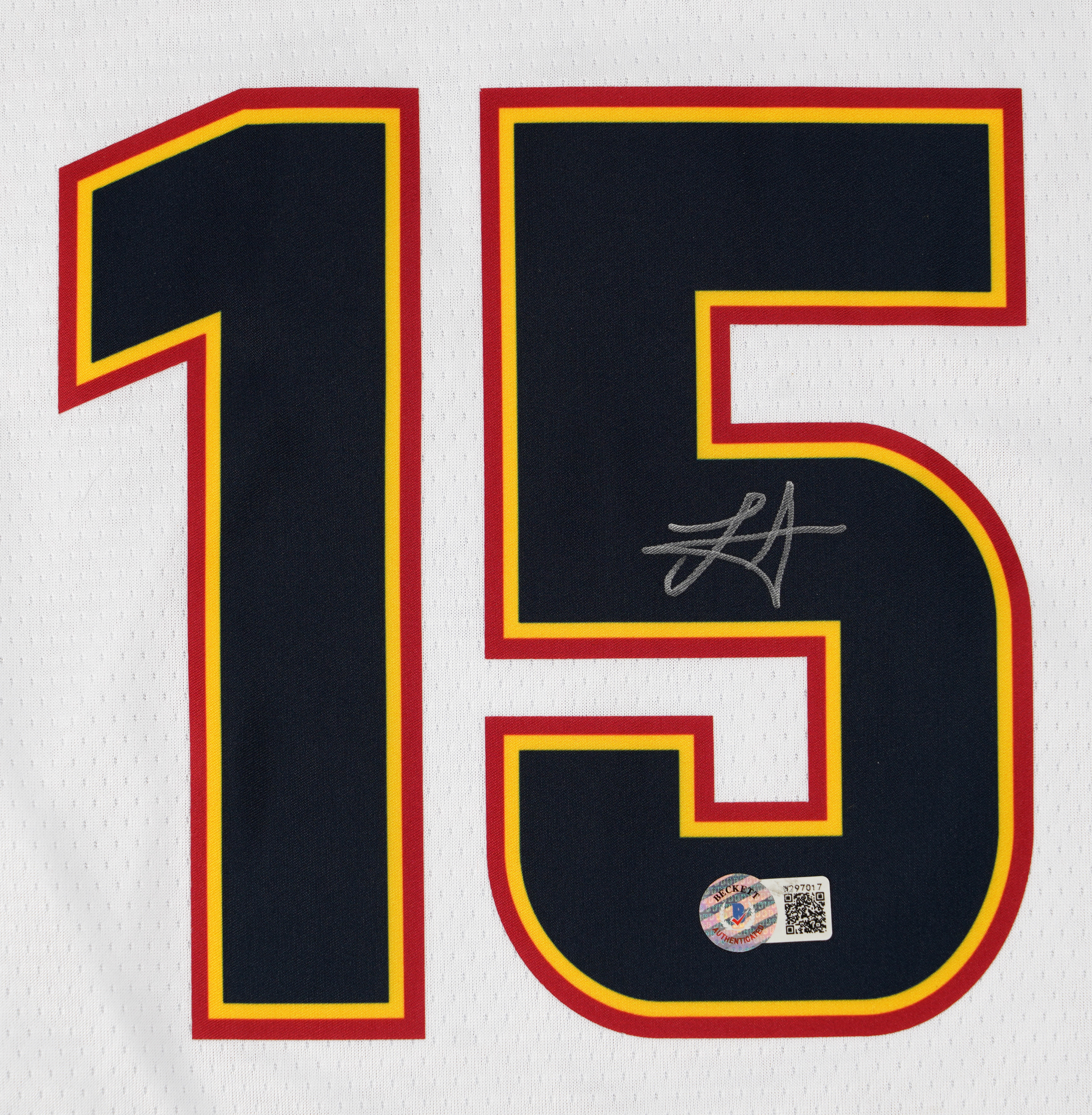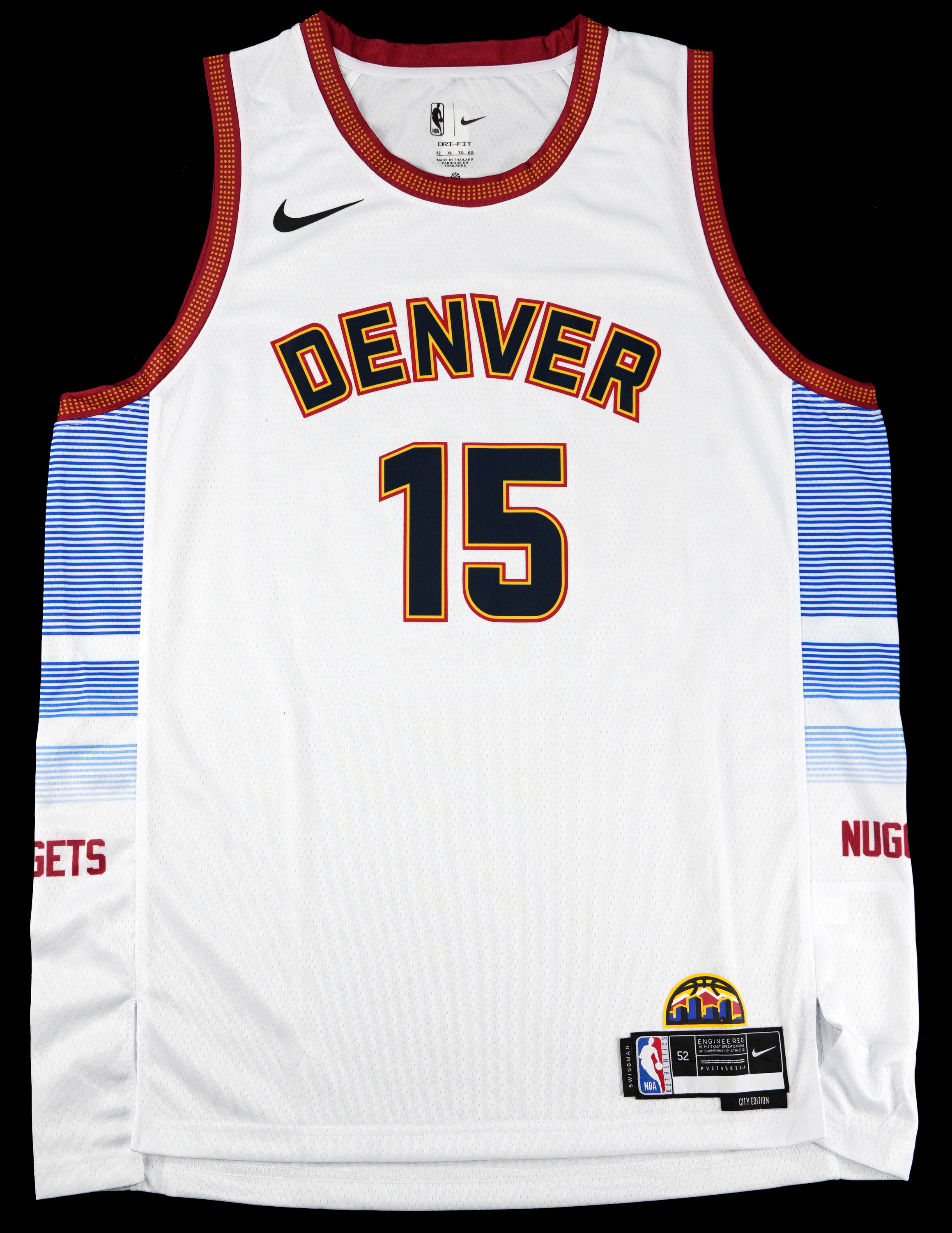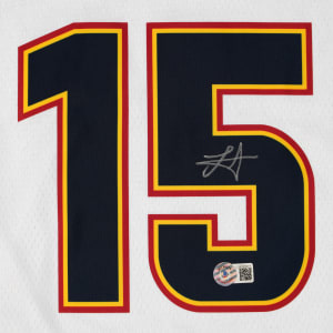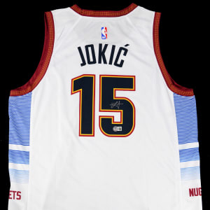 Widely considered one of the greatest players and centers of all-time, Nikola Jokic has three NBA Most Valuable Player awards. This Denver Nuggets jersey with “City Edition” tagging is NBA authentic size 52. The number 15 on the back is signed by the Serbian Center on the “5” (“8-9”) which also displays a Beckett Hologram. Comes with Certification verification for “W297017” and Comment: “Beckett Witnessed on 2/10/2023 in Charlotte, NC.”