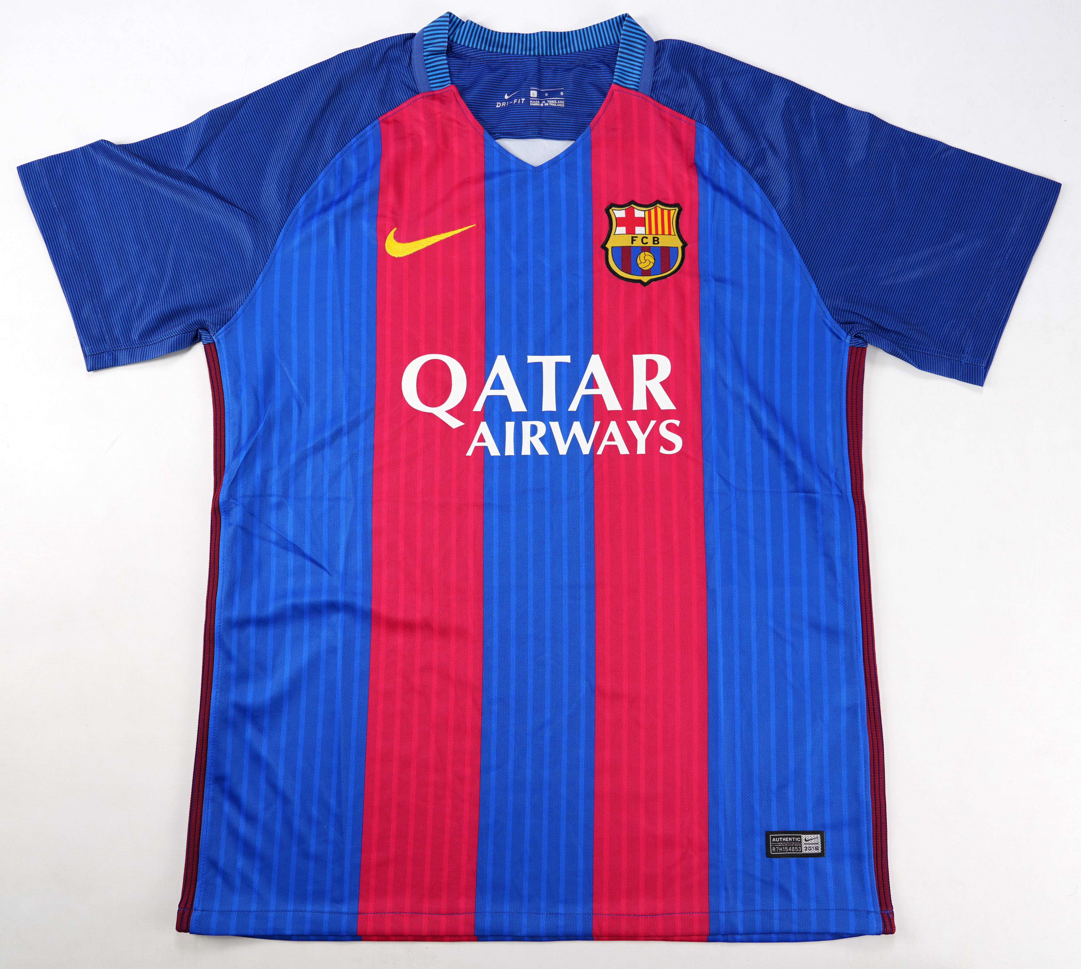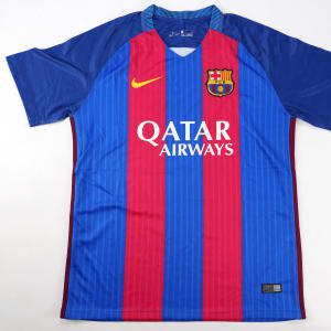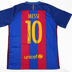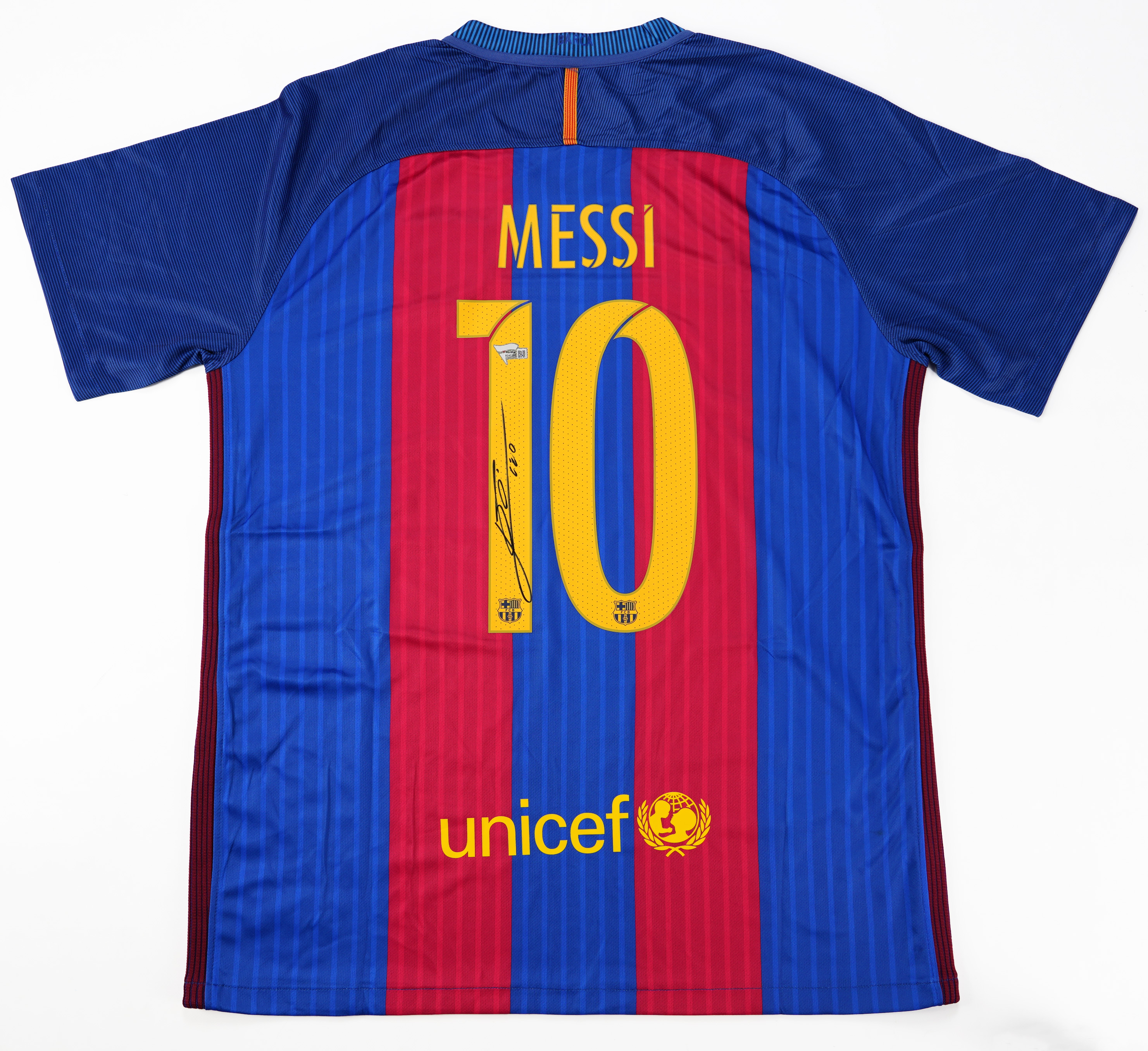 From 2004 to 2021, Barcelona would be the home to arguably the greatest player to ever step foot on the pitch. In his 778 appearances for the Catalan club, Lionel Messi amassed 672 goals, along with a mind-boggling 941 goal contributions, while bagging thirty-four titles for the Blaugrana. Presented is a Nike Dri-Fit (size L) kit issued for Barça's 2016 campaign, adorned with a Nike authentic front tail tag, proper sponsorships, an embroidered team crest, and the Nike swoosh logo. The back is highlighted by a black Sharpie signature from the GOAT, with a Fanatics hologram affixed to the same number. Fanatics COA included.