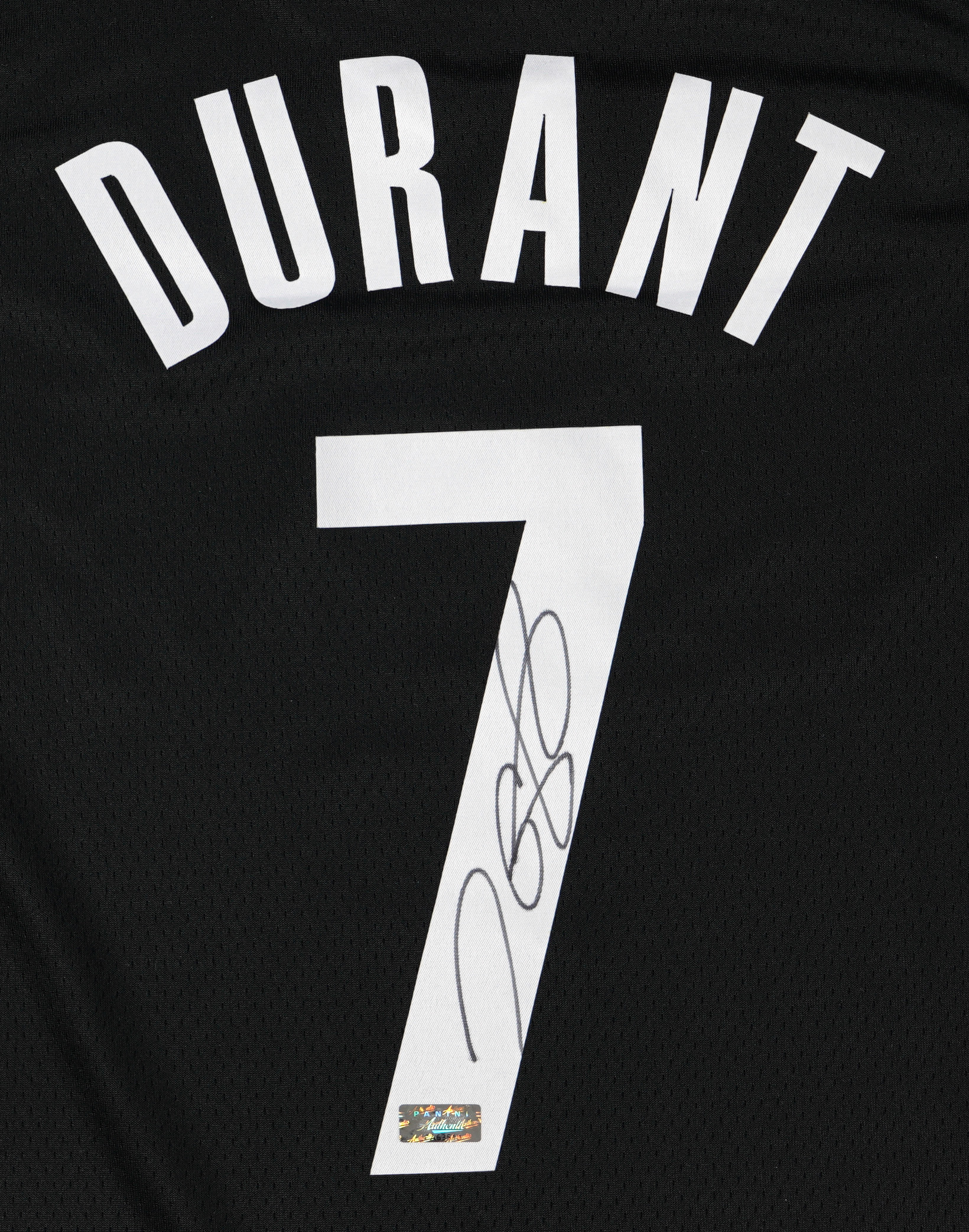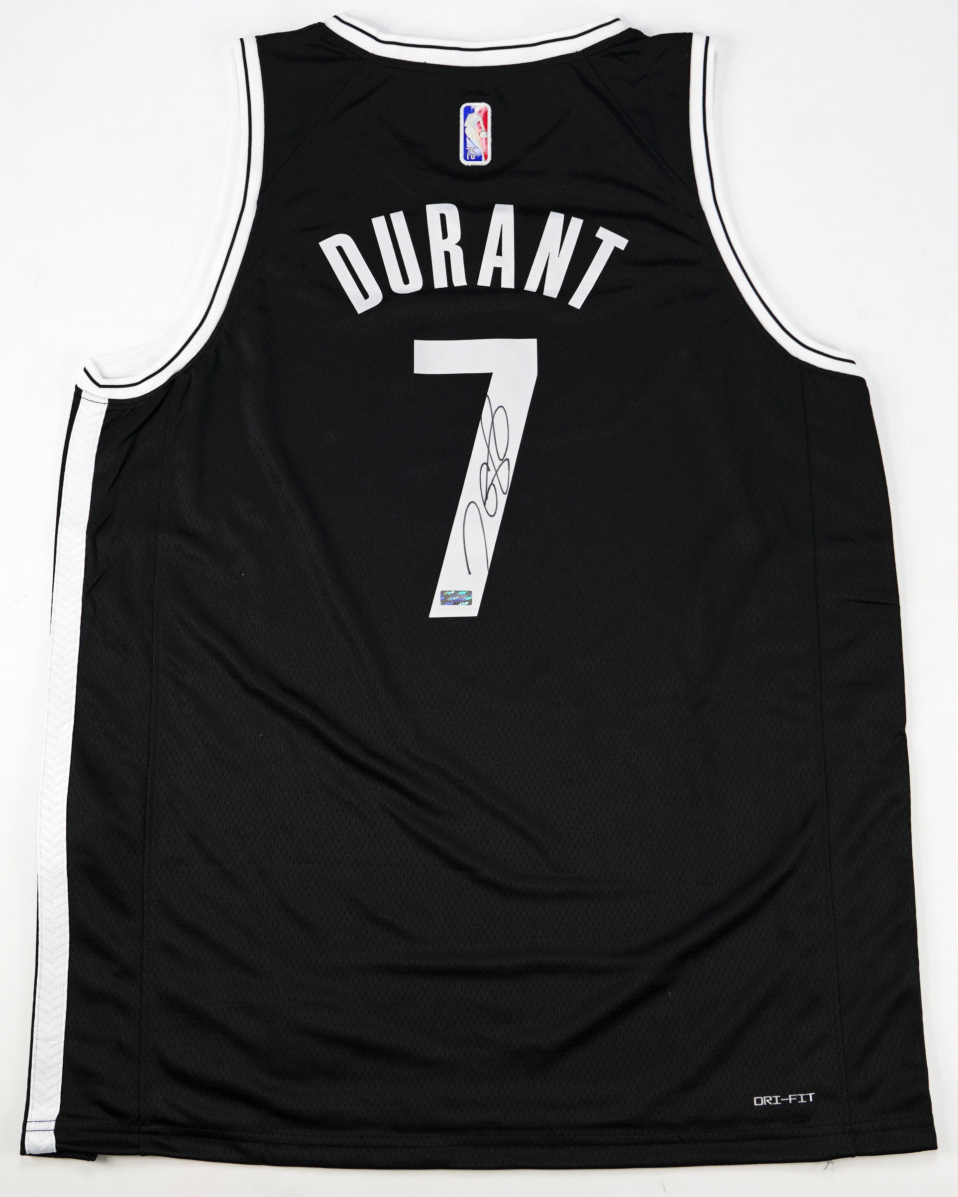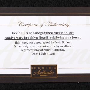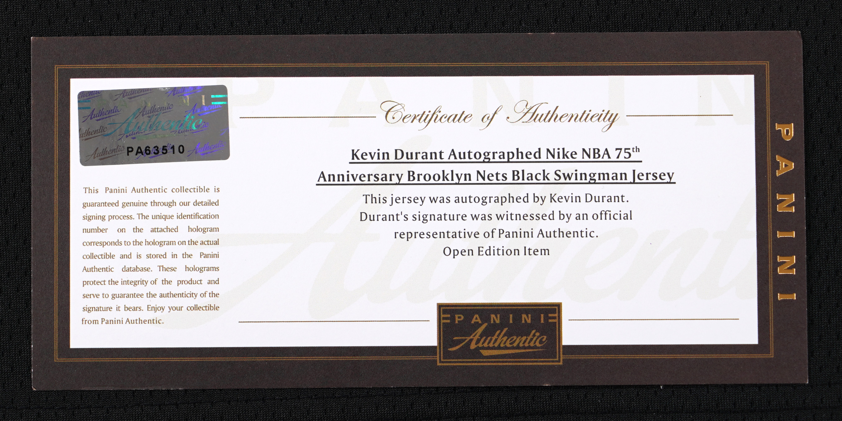 This white on black New York Nets jersey has the NBA 75th Anniversary patch on the back, along with “Durant” and “7” which Durant has signed with a bold (9-10) signature. The Panini Authentic sticker is also on the #7, and it comes with an accompanying Certificate of Authenticity. The tagging in the jersey shirt tail has “Swing Man - 75 Anniversary - Size 52 with Nike swoosh - Icon Edition.”