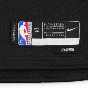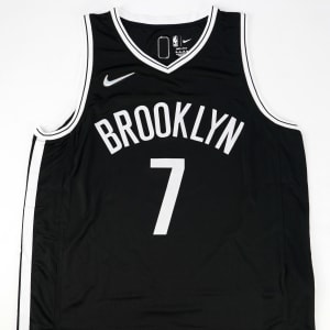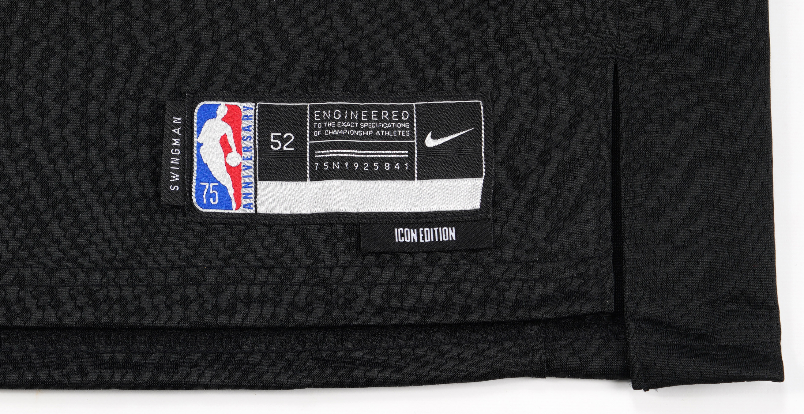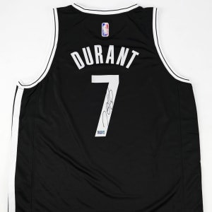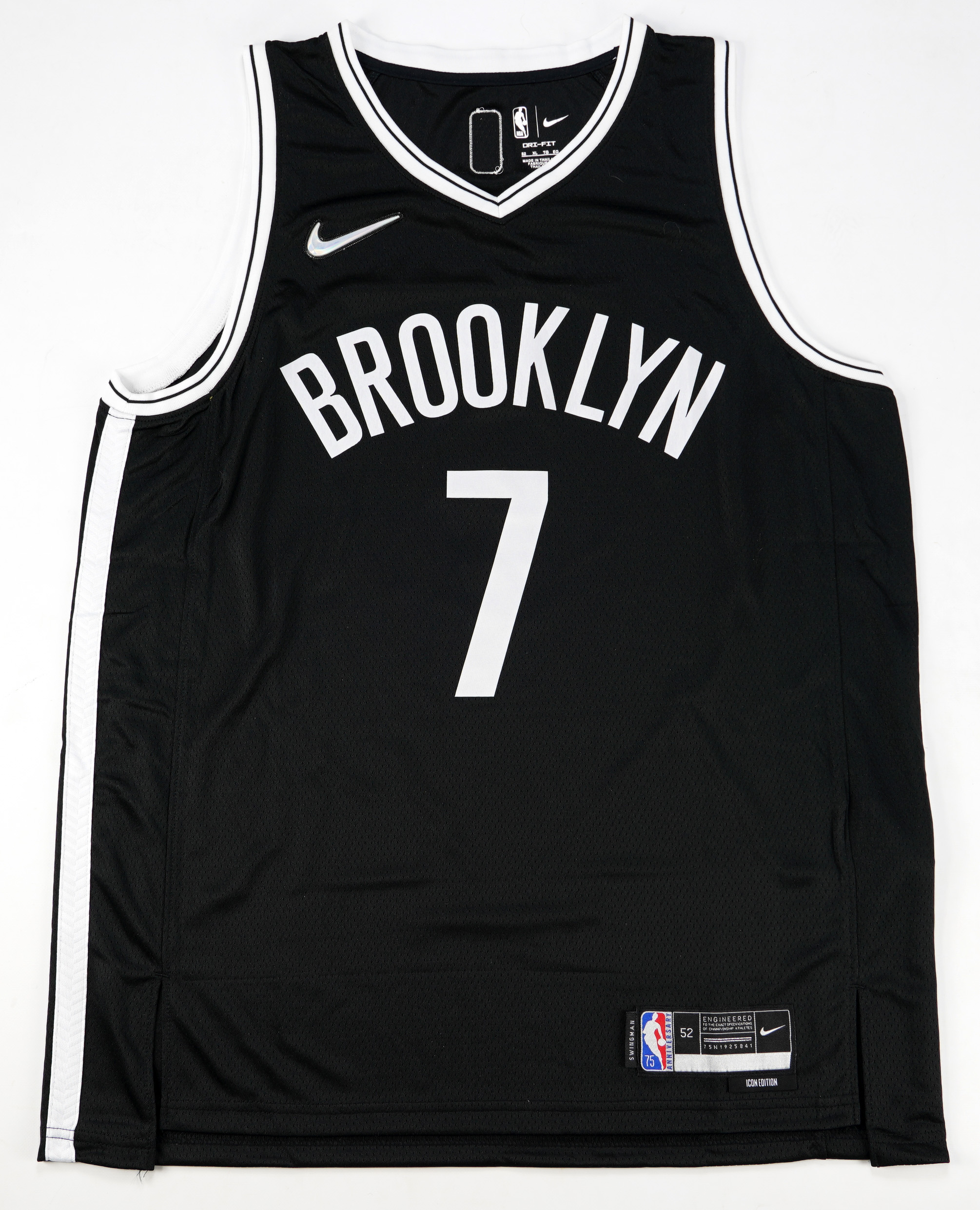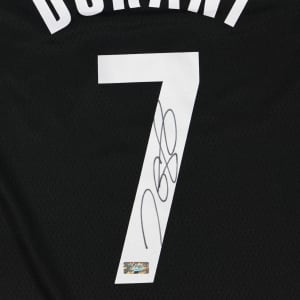 This white on black New York Nets jersey has the NBA 75th Anniversary patch on the back, along with “Durant” and “7” which Durant has signed with a bold (9-10) signature. The Panini Authentic sticker is also on the #7, and it comes with an accompanying Certificate of Authenticity. The tagging in the jersey shirt tail has “Swing Man - 75 Anniversary - Size 52 with Nike swoosh - Icon Edition.”
