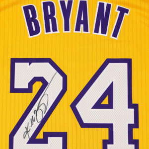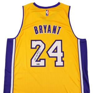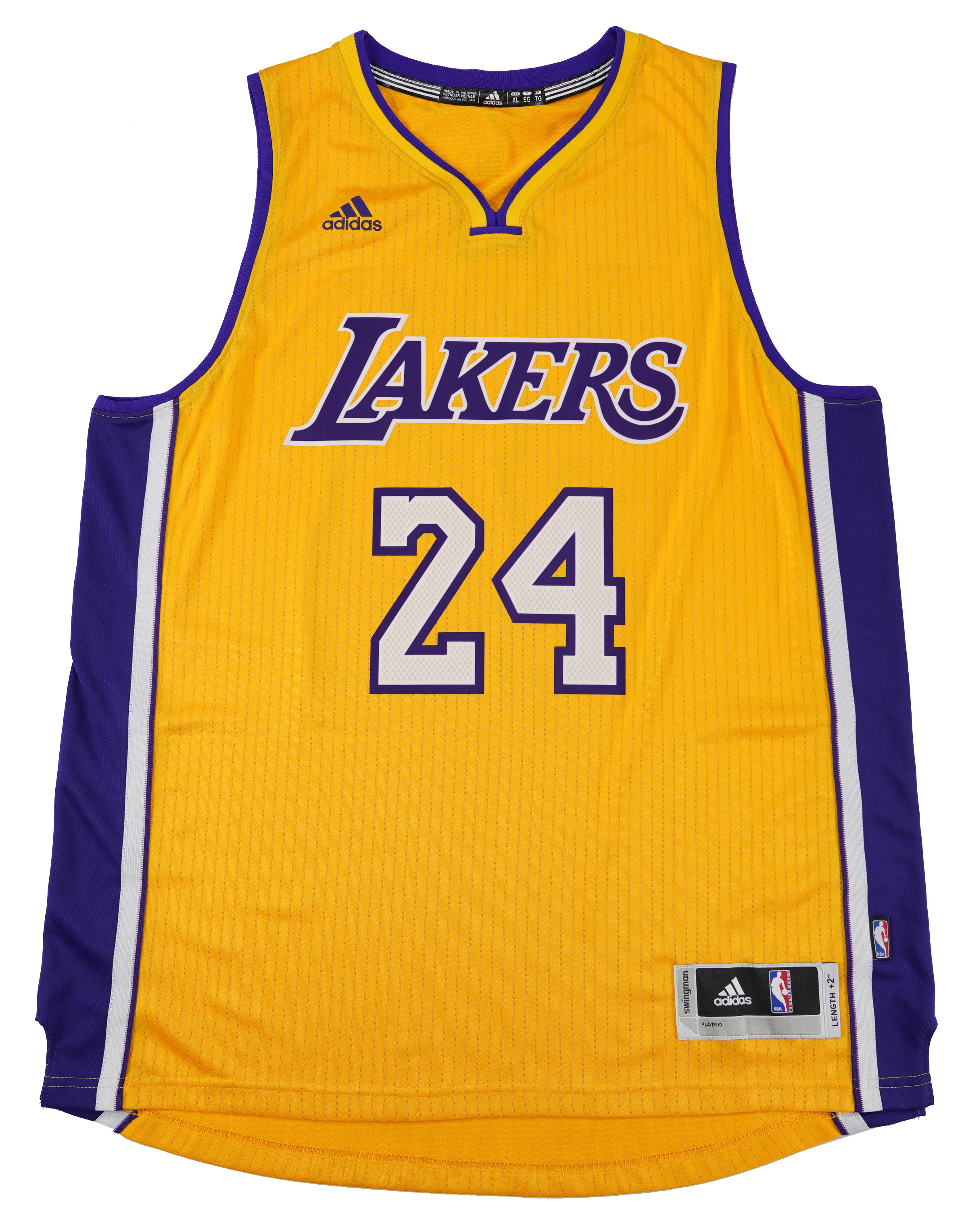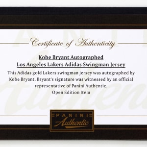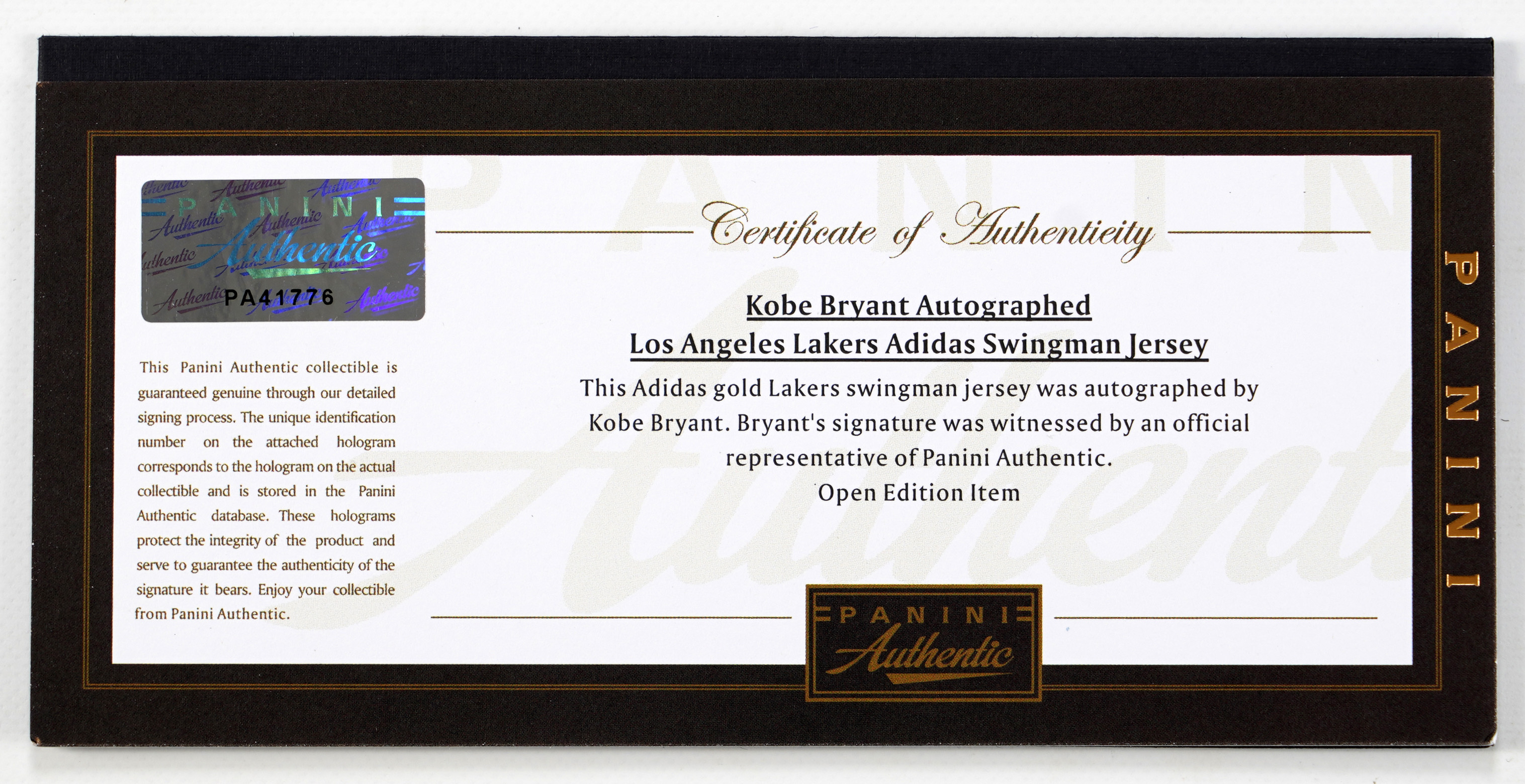 Gone too soon. Kobe Bryant's accolades include five NBA Championships, two NBA Finals MVP's and eighteen All-Star campaigns... amongst countless others . Commemorate his unforgettable career with this signed Adidas Swingman (size XL) Los Angeles Lakers jersey. The classic "purple and gold" top reports in like-new condition, signed in black on the back's number two of his iconic "24". Adidas factory labeling on the front left tail indicates a length " + 4" customization. This display-worthy jersey features a Panini Authentic hologram with the matching Panini COA included.