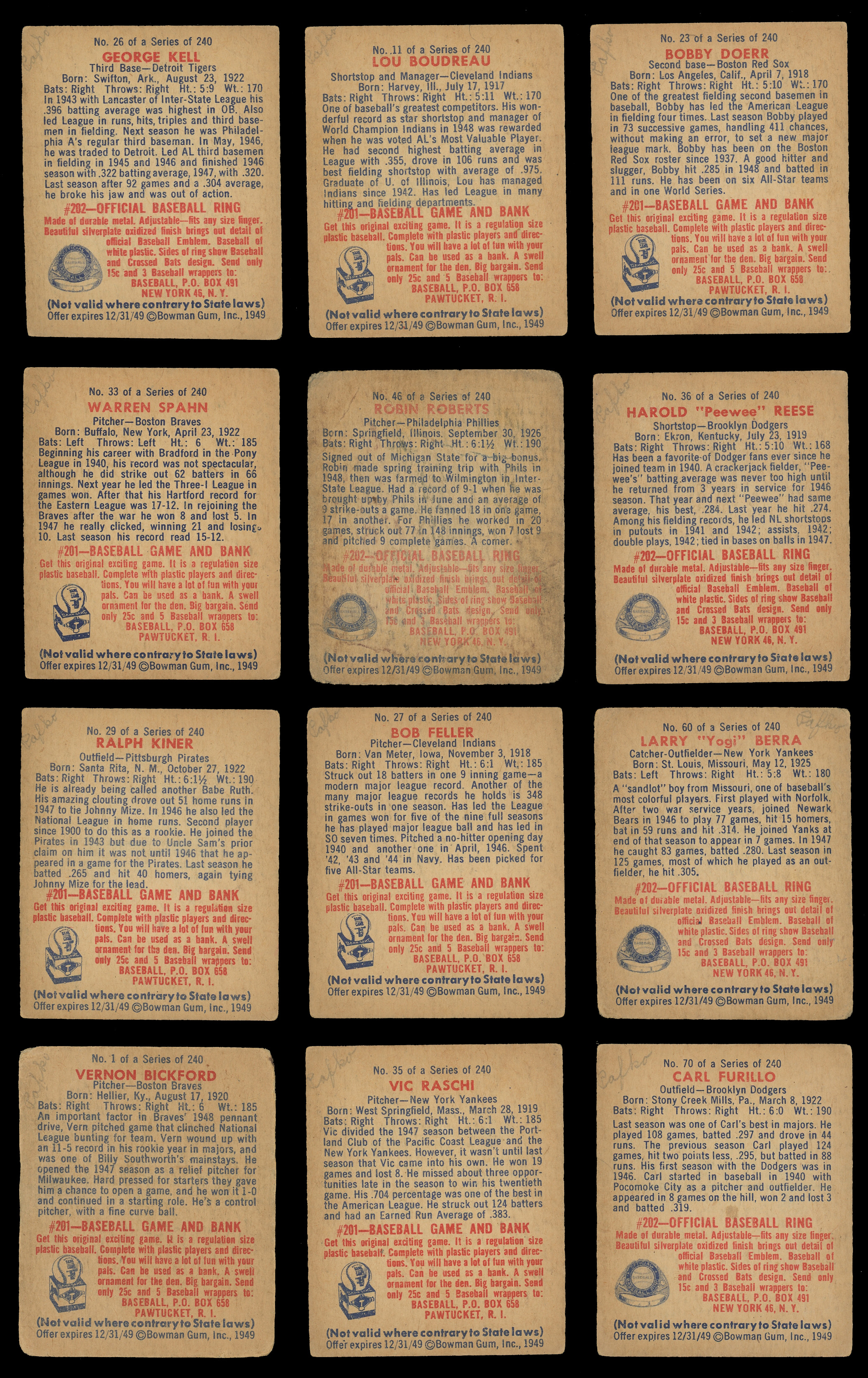 Launch into the 1949 Bowman edition with the offered starter set of (60) cards with nine Hall of Famers and a pair of high numbers. With exception to reverse writing on the upper left corners of the backs, the fronts otherwise present off-to-mid-grade. Highlights include: #1 Bickford RC, #11 Boudreau RC, #23 Doerr, #26 Kell RC, #27 Feller, #29 Kiner, #33 Spahn, #35 Raschi RC, #36 Reese, #46 Roberts RC, #60 Berra and #70 Furillo RC.