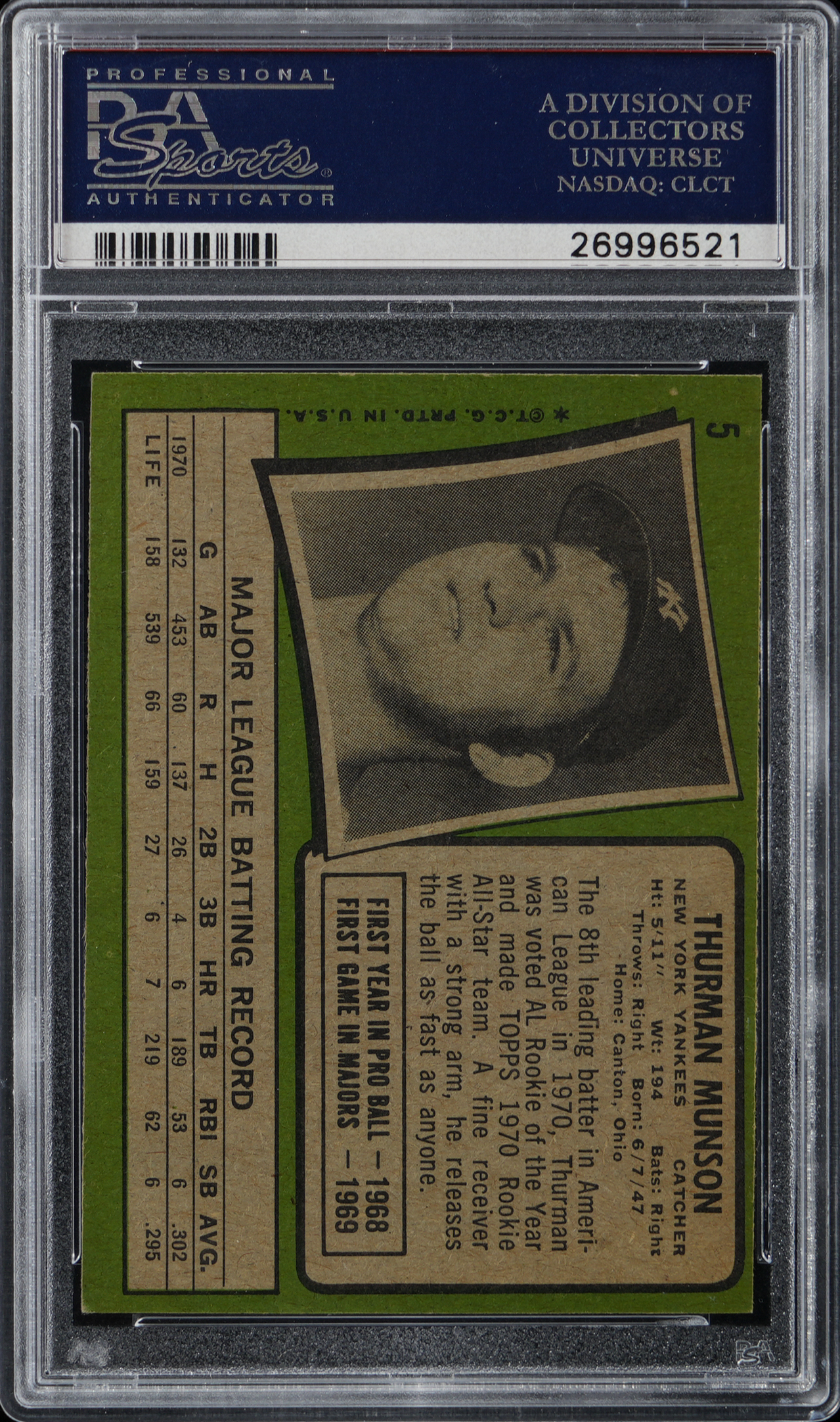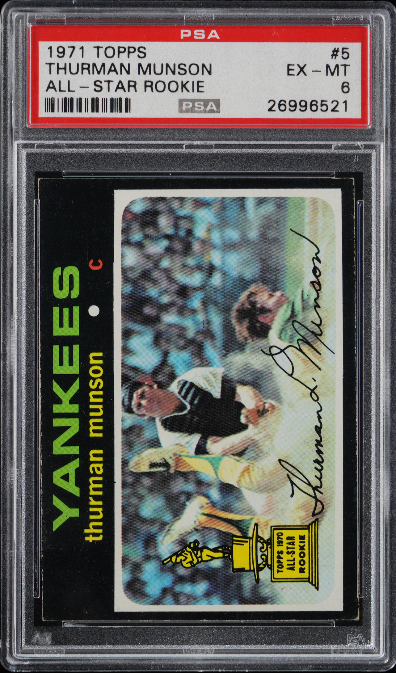 Graded EX-MT 6 by PSA. New York Yankees backstop Thurman Munson battles through a home plate collision on the offered 1971 Topps #5 horizontal single. This condition sensitive second-year Munson meets the criteria needed for its overall evaluation.