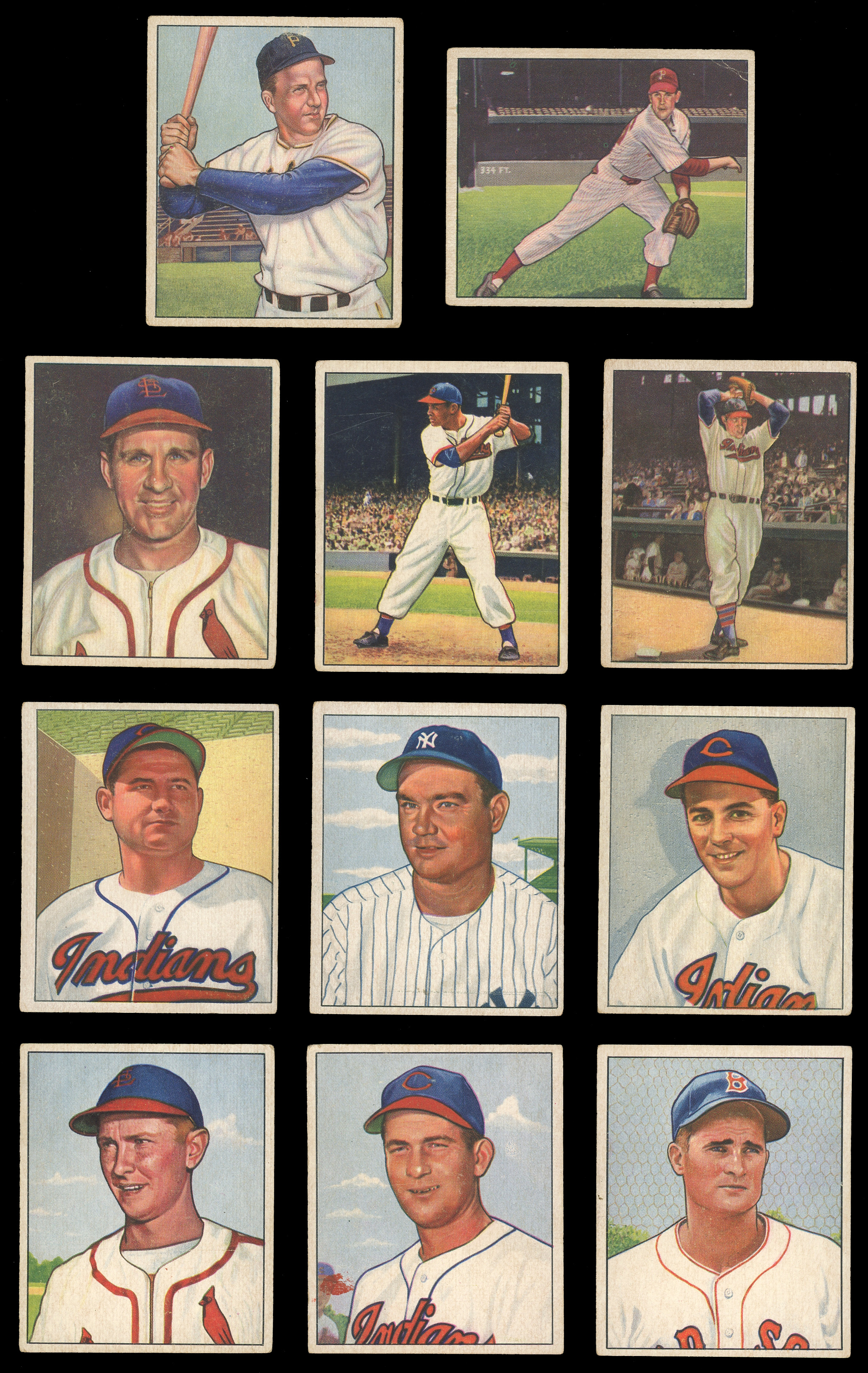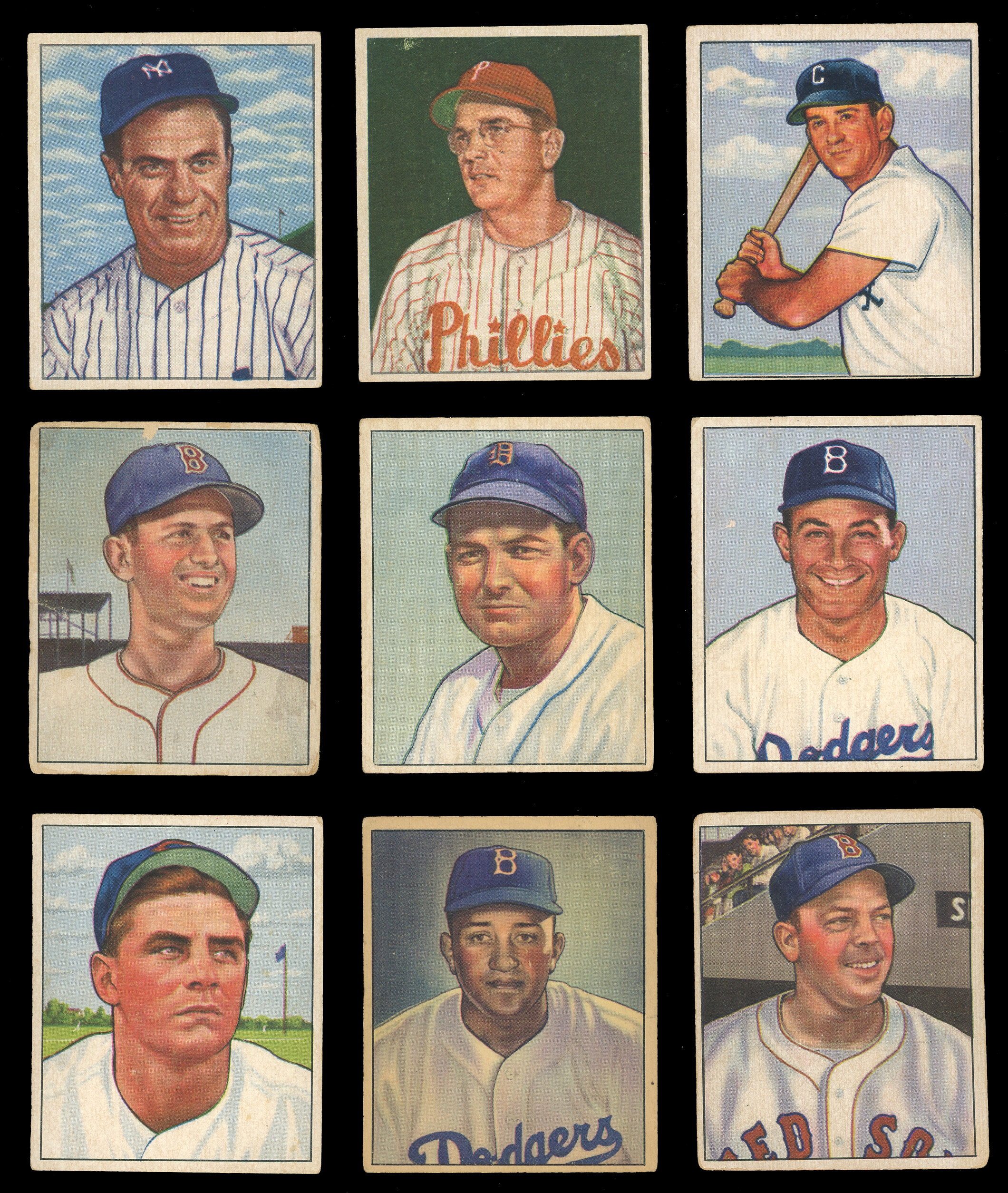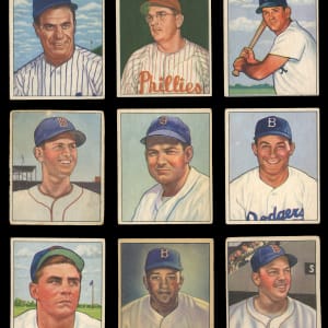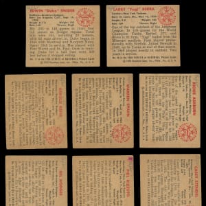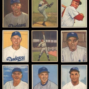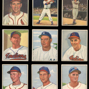 Showcased is a 1950 Bowman near set of (246/252) cards with most keys present. With exception to reverse writing on the the backs, the colorful fronts otherwise present off-to-mid-grade. Highlights include: #1 Parnell RC, #6 Feller, #8 Kell, #11 Rizzuto, #19 Spahn, #21 Reese, #23 Newcombe RC, #32 Roberts, #33 Kiner, #35 Slaughter, #37 Appling, #39 Doby, #40 Lemon, #43 Doerr, #46 Berra, #58 Furillo, #62 Kluszewski, #71 Schoendienst, #75 Campanella, #77 Snider, #84 Ashburn, #94 Boudreau, #112 Hodges, #139 Mize, #148 Wynn, #215 Lopat, #217 Stengel, #219 Bauer RC, #220 Durocher, #226 Konstanty RC, #229 Frisch and #252 DeMars RC.